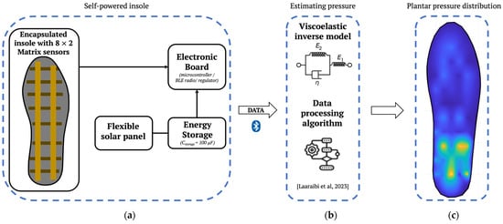 System diagram. (a) Self-powered encapsulated insole using a flexible solar panel; (b) inverse viscoelastic model [3]; (c) plantar pressure distribution sensing.