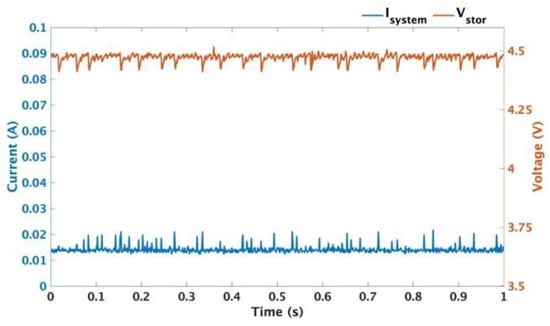 Figure 2 shows the voltage Vstor across the capacitor Cstorage using a PV panel to provide indoor lighting. The value chosen for this capacitor was 100 µF to allow a margin and extra energy capacity to supply the whole system, and Isyst represents the current flowing through the system.
