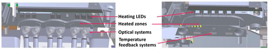 The system consists of 2 components: the analyser and microfluidic cartridge, which are presented in Figure 1. The basis of the heating system is the electromagnetic radiation to thermal conversion happening directly on defined and insulated areas of the cartridge made by injection moulding from cyclic olefin copolymer (COC). Each card contains both liquid and freeze-dried reagents needed in the sample processing from the extraction of NA to the amplification of genetic material in 6 spatially separated chambers on 3 thermally independent areas that enable multiplexing. Additionally, a plurality of valves and pump mechanism for fluid movement is present on the cartridge. The analyser operating the card is a handheld device that, beyond the display, actuators and other control elements, contains the heating and detection elements that utilise 2 heating units with 24 UV LEDs (400 nm) in total, with a temperature detector for each of the heating zones, as well as 6 fluorescence detectors coupled with optical filters. In that way, we can achieve precise temperature measurement of each of the heated areas, allowing for the best performance of assays present on the cartridge without embedding heaters or sensors within the card while allowing for lower energy consumption. The principle of operation of heating and detecting systems is presented in Figure 2.