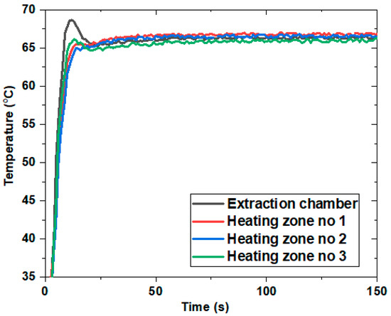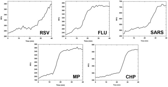 Thermally separated extraction chamber to enable the extraction of nucleic acids with an accuracy of ±2 °C. Three thermally separated the heating zones to provide the best thermal conditions for up to six LAMP assays with an accuracy of ±1 °C. The temperature ramps are presented in Figure 3 and the fluorescence readings are presented in Figure 4. These data show capability of the developed system to detect five pathogens within a max. of 30 min. That milestone, in combination with the whole system miniaturization, place it at the top of most efficient methods.