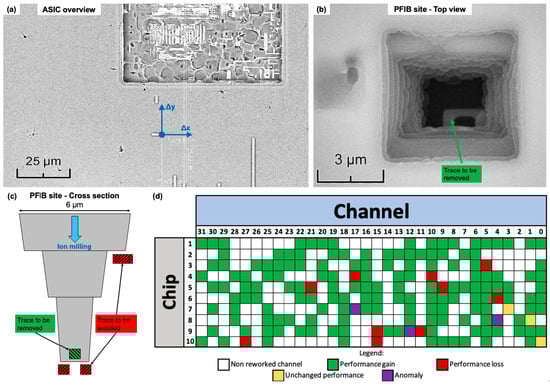ASICs comprising 32 channels were used in this analysis. In the ASICs used, the initial average number of fully operational channels was only 48%, and, as shown in Figure 1d, their distribution was unpredictable among the batch of chips tested (additionally confirmed via measurements of another 20+ chips that were yet to be subjected to the reworking). This is speculated to be caused by the design tolerances in complex multi-metal layer stacks such as ASIC that can have a high impact on channel-specific performance. Fault diagnosis was carried out to identify a PFIB reworking procedure for the remaining 52% of the channels. A two-step optimization process for the milling recipe was carried out. Firstly, the milling recipes were tuned to achieve the right depth in the area of interest while minimizing the milling volume and interference with adjacent structures. Secondly, the speed of the operation was optimized, as it represented a balance between time (i.e., the ion beam current, which can typically be changed in increments of 4 times as it is linked to physical apertures) and clean vertical walls (i.e., lower material re-sputtering). This optimization brought some fine nuances to the PFIB process for the design milling crater in Figure 1c, and its final results are depicted in Figure 1d. The overall performance recovery was significant, improving from below 50% to more than 90%.