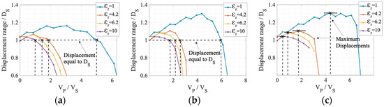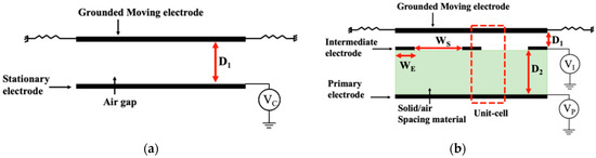 Simulations show that the higher the permittivity of the solid material, the smaller VP at which the DS displacement occurs. However, the maximum displacement possible before snap-down and FOM (unipolar and bipolar) are higher at a smaller εr. In all cases, the larger gap spacing (WS = 18WE) provides greater maximum displacement possible before snap-down, but a lower FOM. Comparing the cases of air (εr = 1) and εr = 4.2, and for the gap spacing WS = 3WE, we see that for bipolar operation, the controlling voltage is reduced by more than two times (2.12 FOMS), needing a primary electrode voltage VP = 2.5VS, while the case of air requires a higher primary voltage for FOM improvement.
