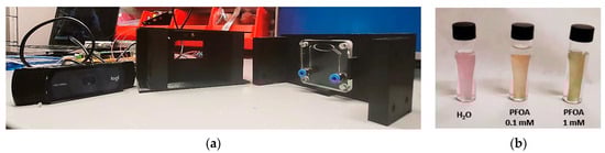 (a) The PT-like instrument setup used for optical measurements (webcam, LED, and homemade holder). (b) The optical responses of the CC-SiTTC(OH), ordered from left to right: distilled water, PFOA (0.1 mM), and PFOA (1 mM).