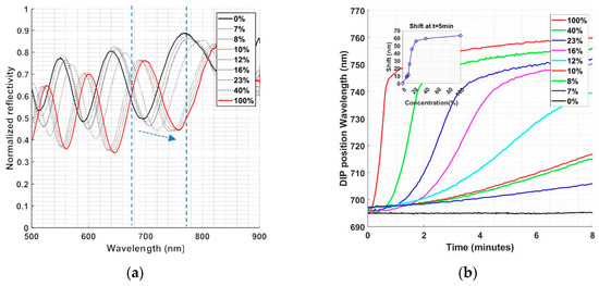 (a) Interference fringes’ red shift (arrow) for increasing ethanol/water concentrations (volume percentage in water). (b) Comparison of the monitored dynamic interference peak shift in an 8 min time frame. The figure inset shows the interference peak shift at t = 5 min for the different concentrations.
