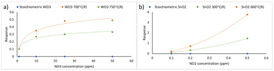 Figure 1. (a) Sensing responses, at a working temperature of 70 °C, of (a) stoichiometric and reduced (R) WO3 powders vs. NH3 and (b) stoichiometric and reduced (R) SnO2 powders vs. NO2.