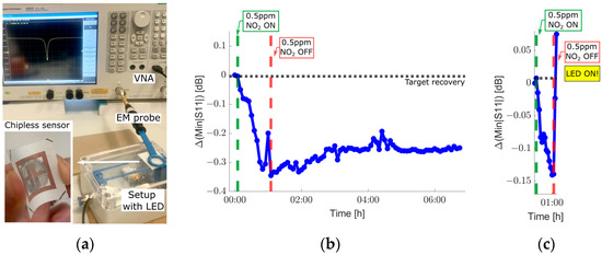 A non-volatile NO2 chipless memory sensor turned into a reusable sensor. (a) Measurement setup; (b) response and recovery trend for the non-volatile memory sensor; (c) response and recovery trend when the sensor is turned into a sensor without memory using a UV LED source.