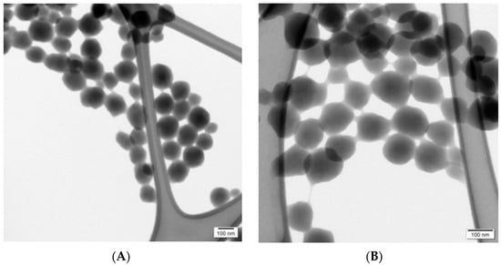 (A) TEM image of a cluster of NIMPs (bar: 100 nm) and (B) MINPs (bar: 100 nm).