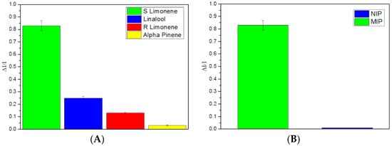 (A) MINP-ESNF sensor response when exposed to 15 ppm of vapors of the enantiomers of limonene (S and R_), linalool and alpha pinene (B) MINP-ESNF and NINP-ESNF sensor response when exposed to 15 ppm of vapors of S limonene.