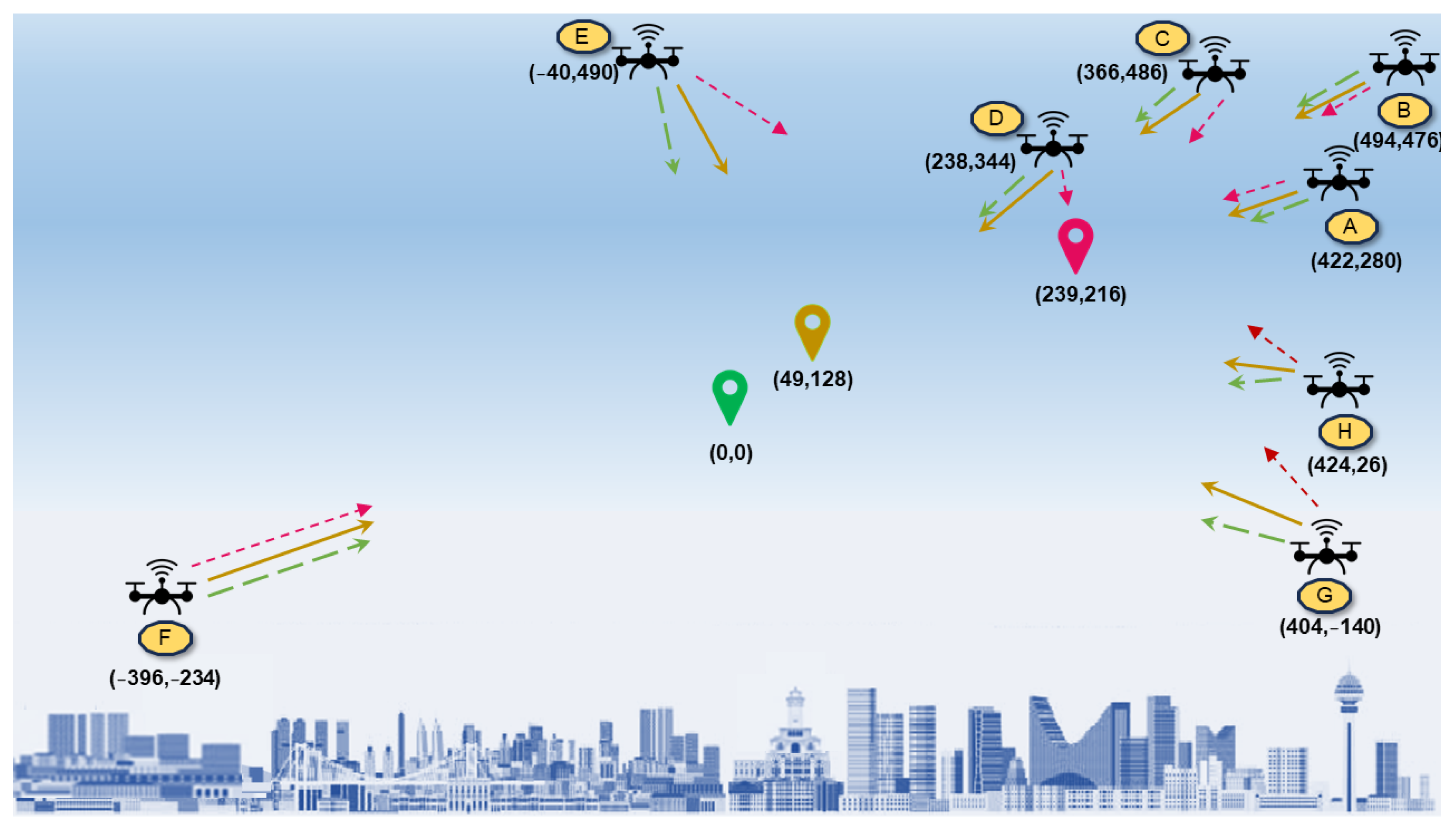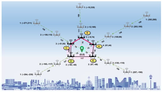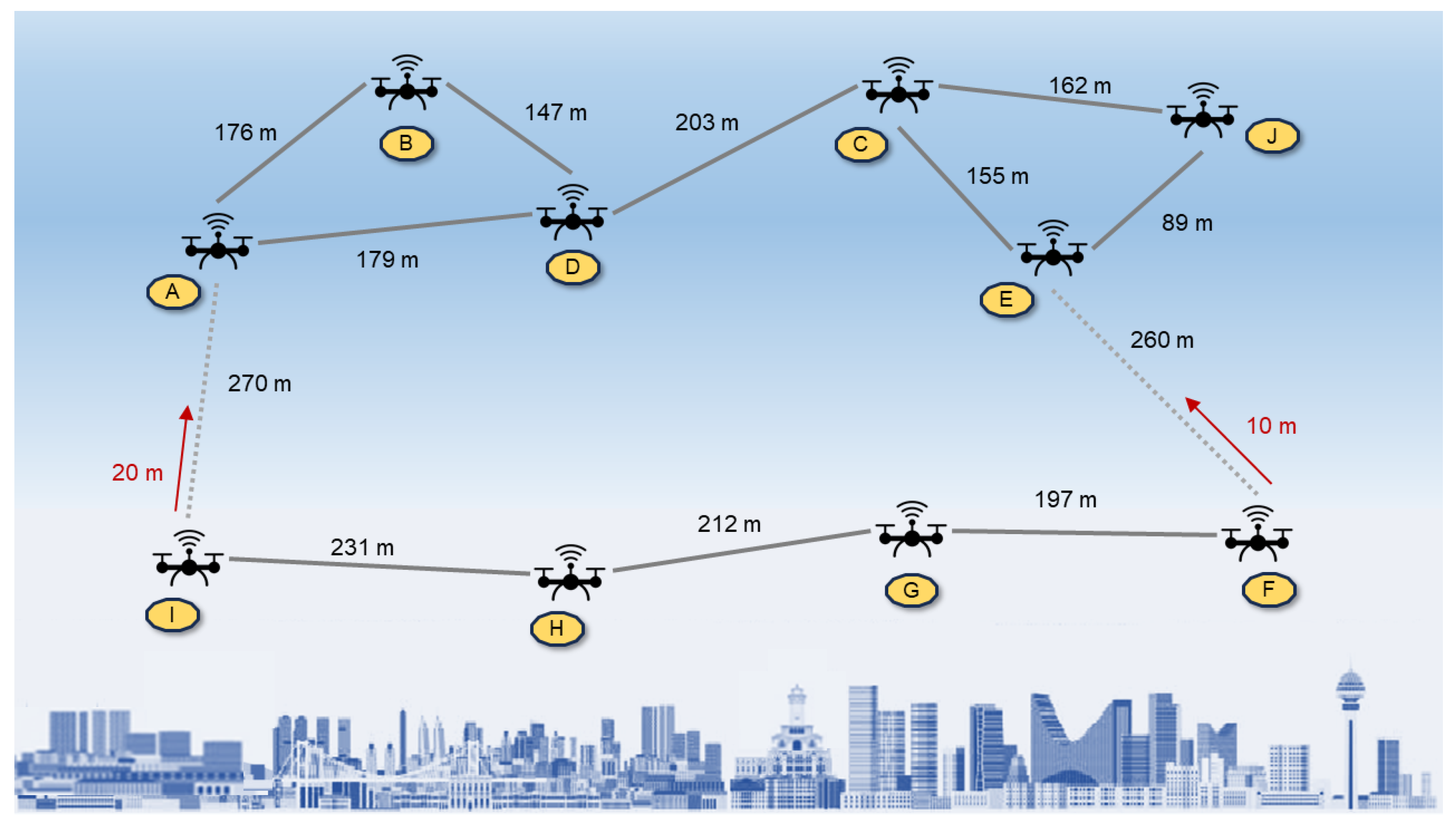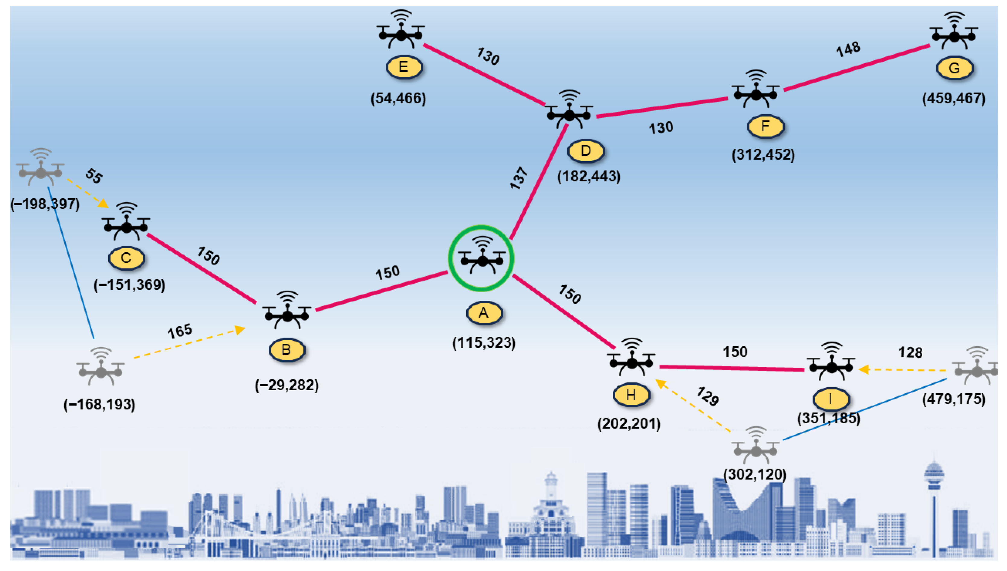 Figure 8 demonstrates a sample application of the MST algorithm. In this scenario, node A is chosen as the central reference point that anchors the network’s reconstruction process. Following the edges defined by the minimum spanning tree, drones B, C, H, and I gradually move toward their MST tree parents, ensuring that their final positions create an uninterrupted communication structure, a