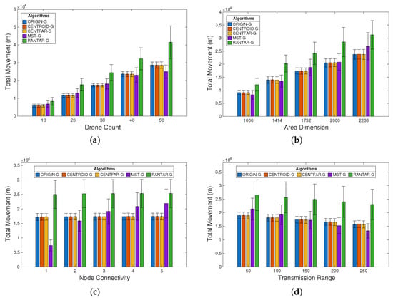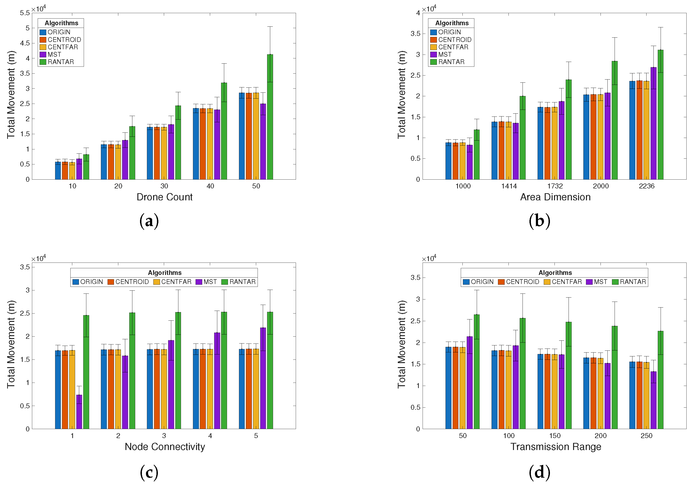 k-connectivity requirements, and transmission ranges. As the number of drones increases, the total movement required by all algorithms exhibits linear growth. Notably, the MST algorithm performs increasingly well with higher node counts. CENTER-based algorithms produce similar results. Similarly, as the network area expands, the total movement generated by all algorithms increases almost linearly. This is expected as maintaining connectivity in larger areas requires more repositioning. The MST algorithm shows improved performance in smaller network areas due to naturally higher connectivity. With increasing