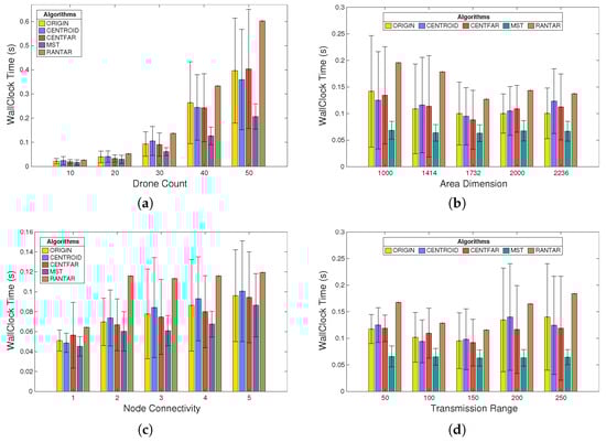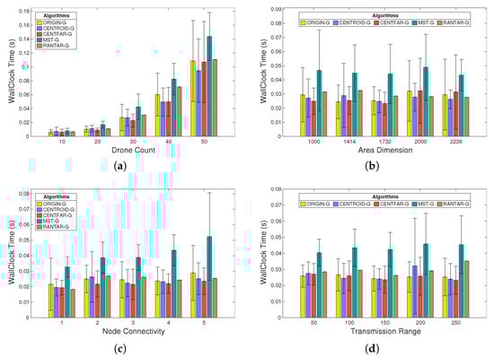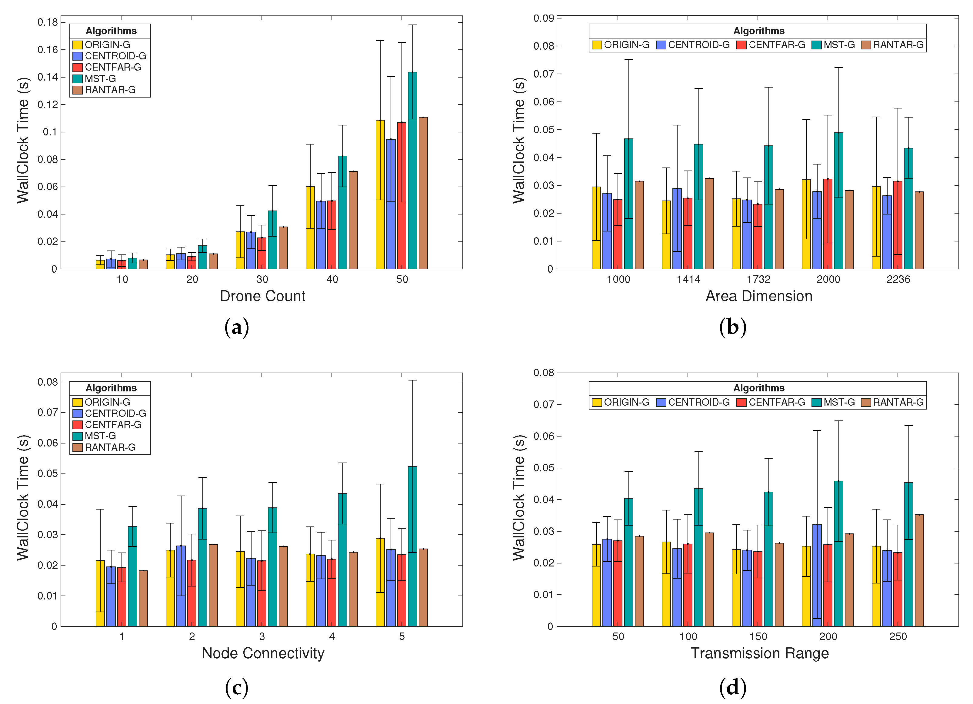 Figure 14. As the node count increases, the time spent by all algorithms increases approximately linearly, indicating that the proposed methods are scalable. Among the algorithms that move nodes individually, MST consistently shows the shortest execution time, making it the most time-efficient in this category. This result aligns well with the complexity analysis. In contrast, the MST-G algorithm, which moves nodes in groups, demonstrates significantly worse performance as the number of drones increases. Execution time also increases with higher