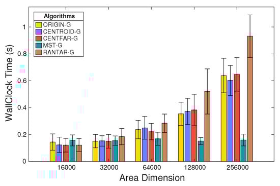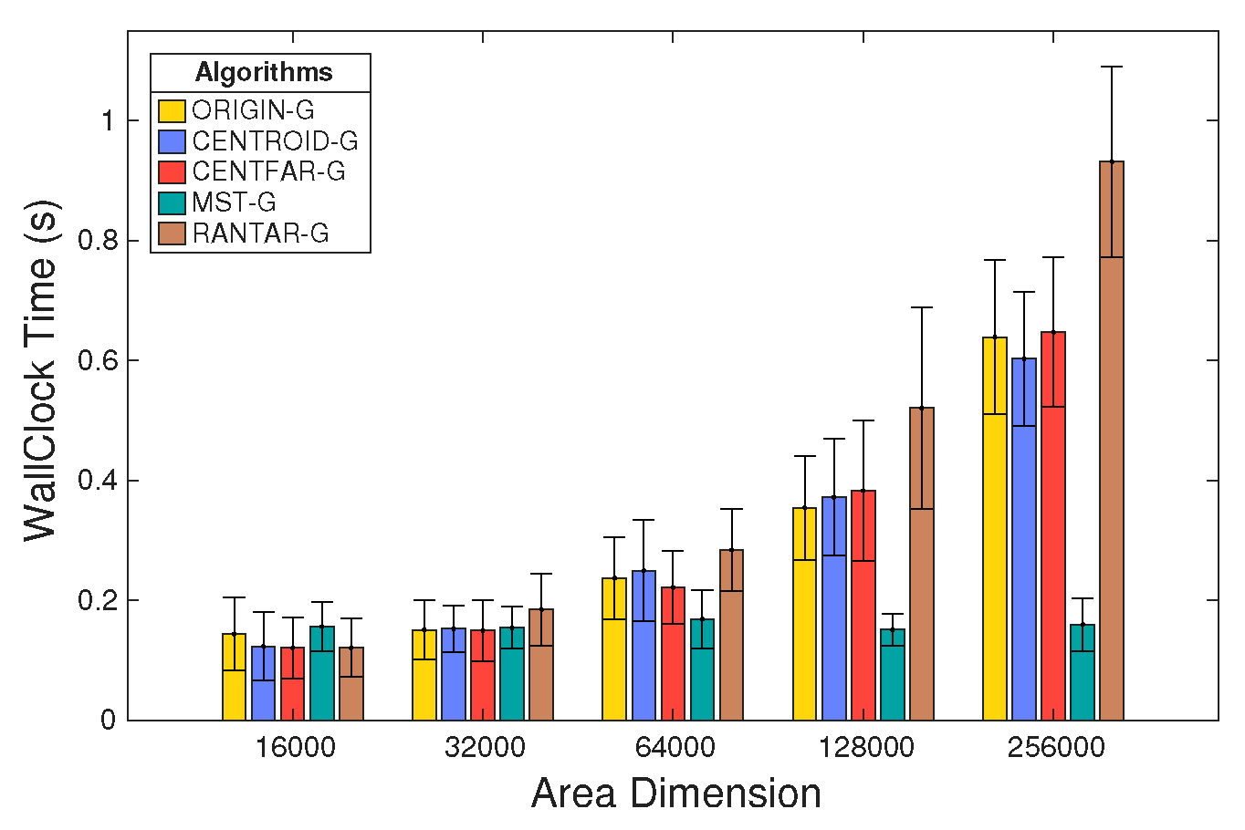 Figure 15 and measured the execution times of the group-based movement algorithms. The obtained results are consistent with the theoretical complexity analysis: MST-G operates significantly faster than the other algorithms, particularly as the area size increases. Moreover, this indicates that the test areas provided in