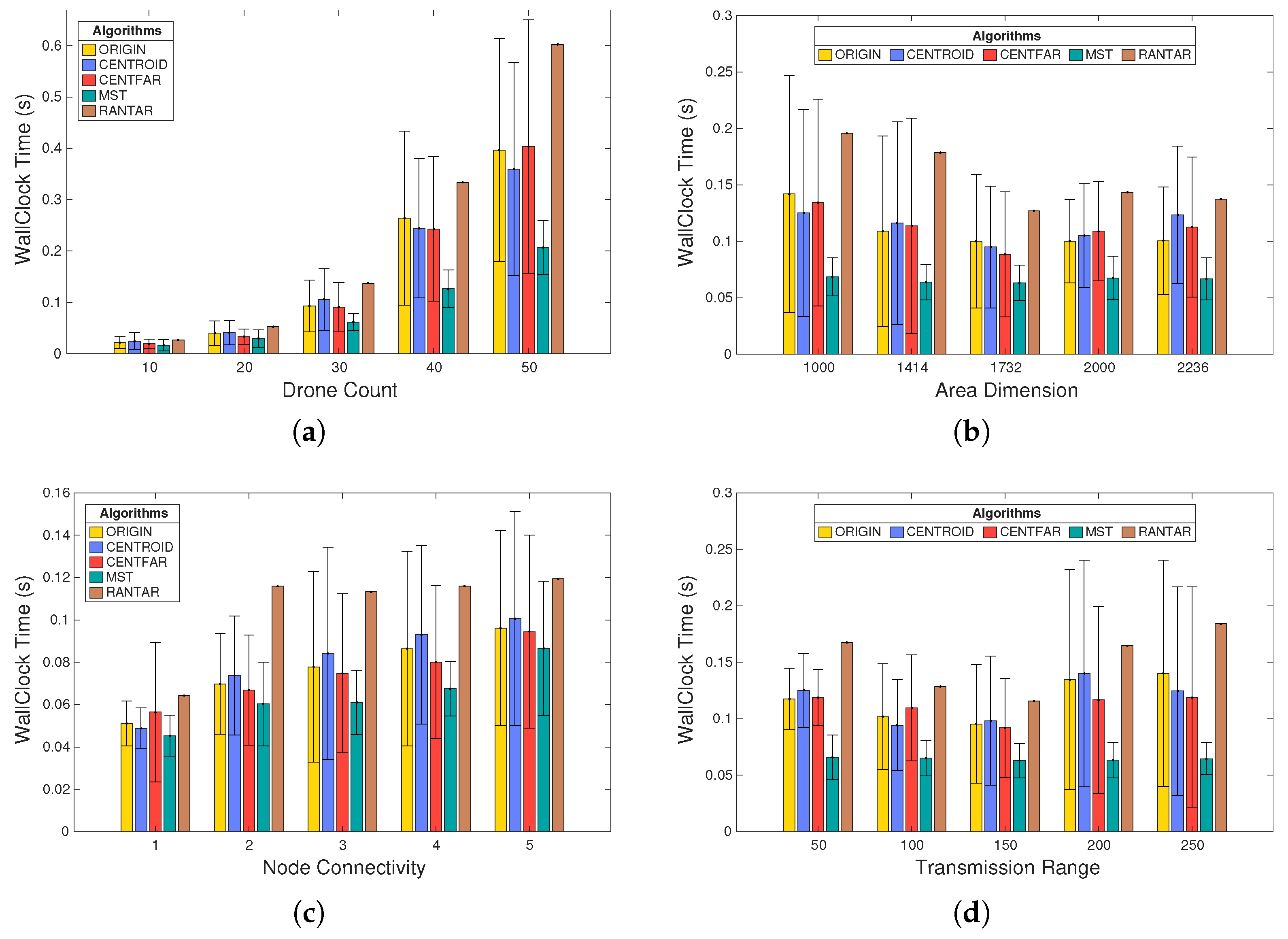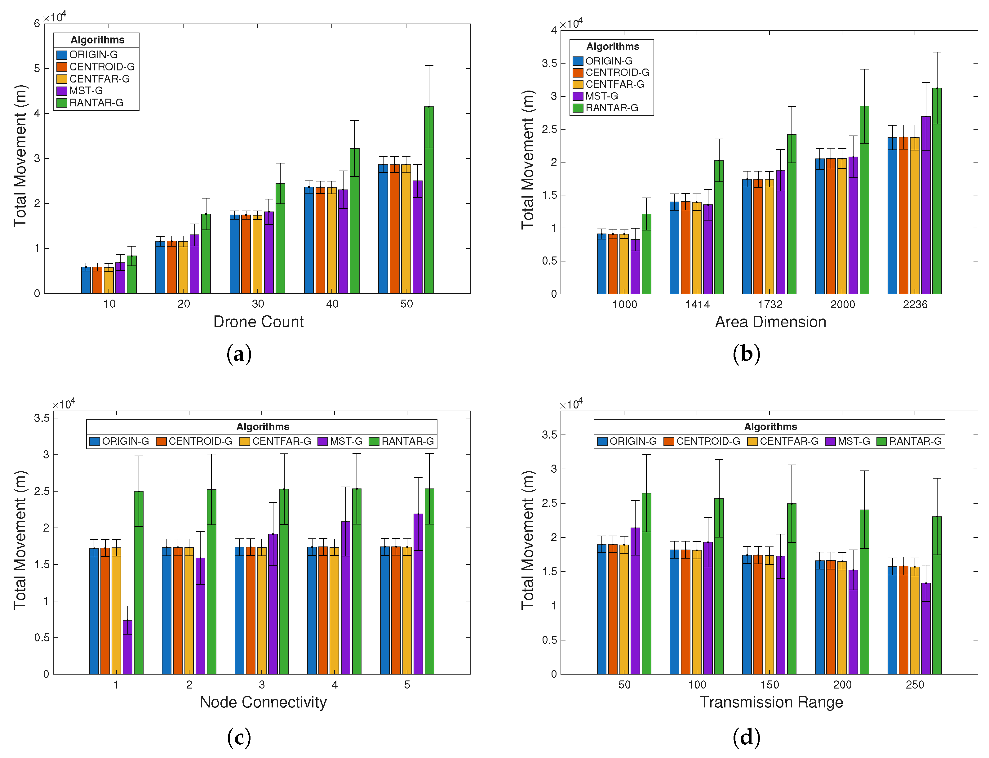 Throughout the evaluation process, three primary metrics were used to quantify performance. First, the Total Movement Distance, which accounts for the sum of distances traveled by all drones to achieve the required connectivity. Second, the Maximum Individual Movement, indicating the largest single movement made by any drone during the process. And third, the WallClock Execution Time, which measures the time taken by the algorithm to compute a valid solution. The experiments aimed to test algorithm performance across different drone counts, area sizes,