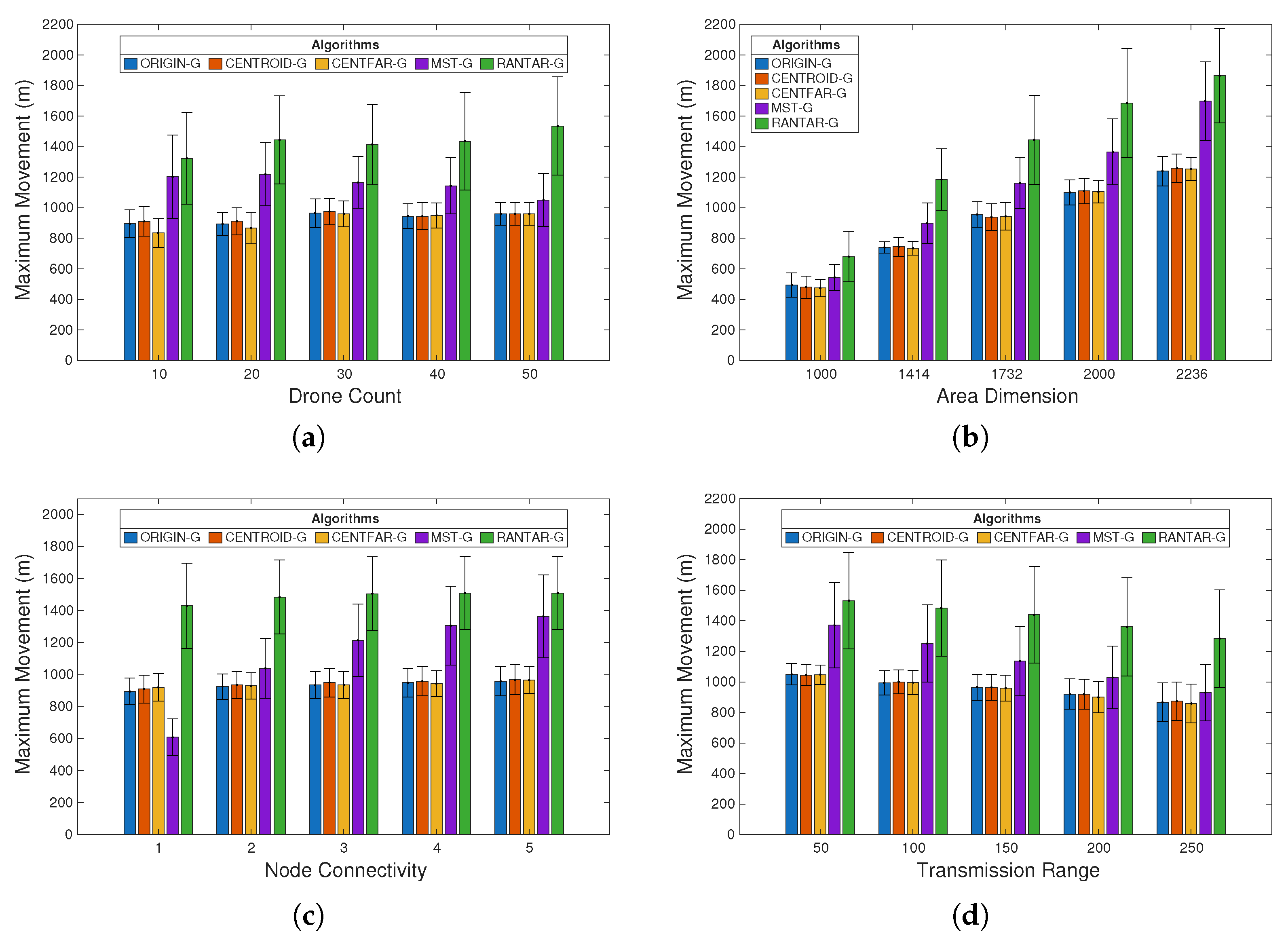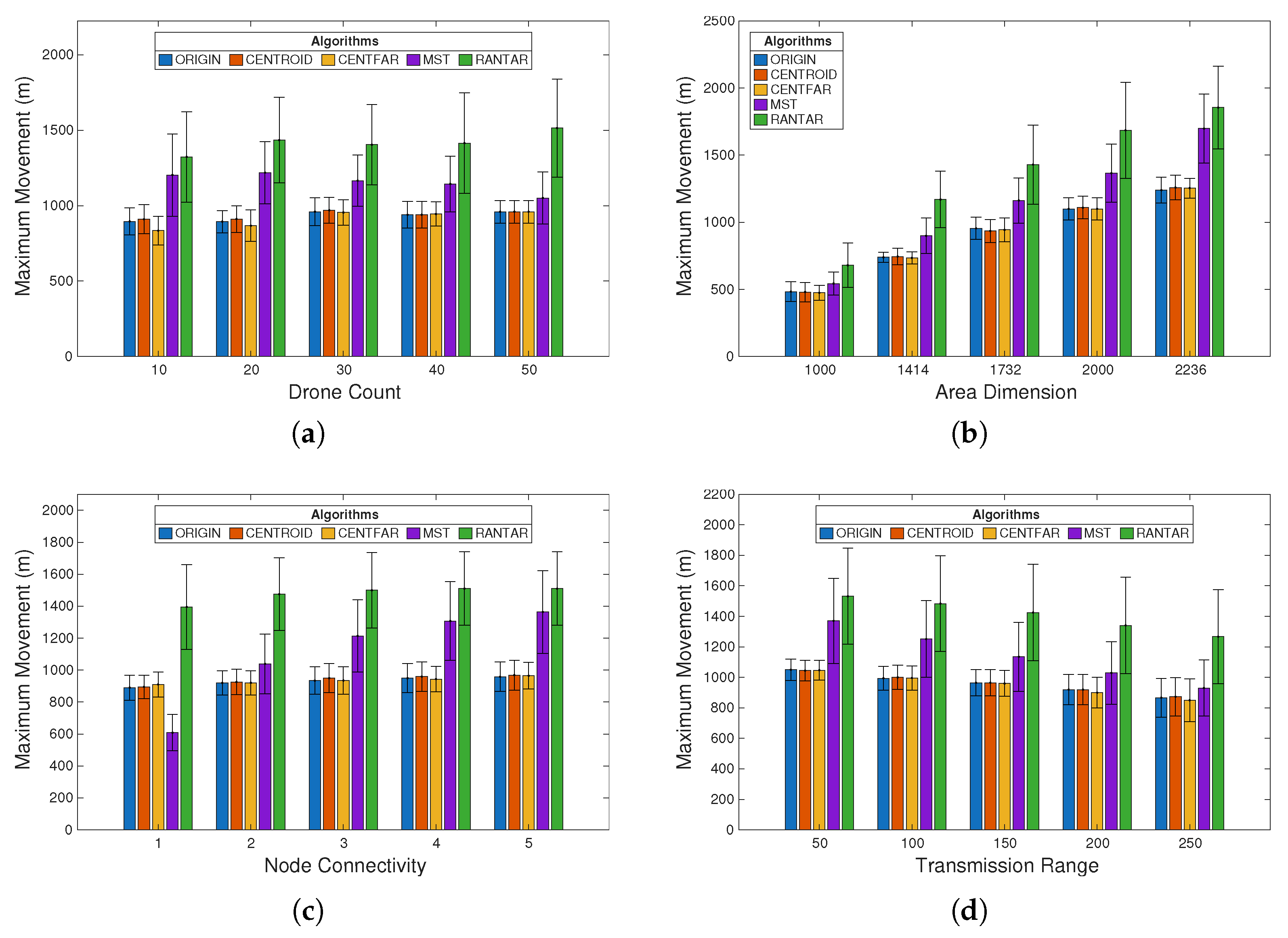 k values, and transmission ranges. As the number of drones increases, the maximum movement produced by the MST algorithm decreases slightly, while the ORIGIN, CENTROID and CENTFAR algorithms show a modest increase in maximum movement. Across all node counts, MST consistently yields the highest maximum movement values, indicating weaker performance in this metric. Similarly, as the network area expands, the maximum movement required by all algorithms increases almost linearly. Yet again, MST produces the worst results across all area sizes, whereas CENTFAR slightly outperforms the other center-based approaches. When