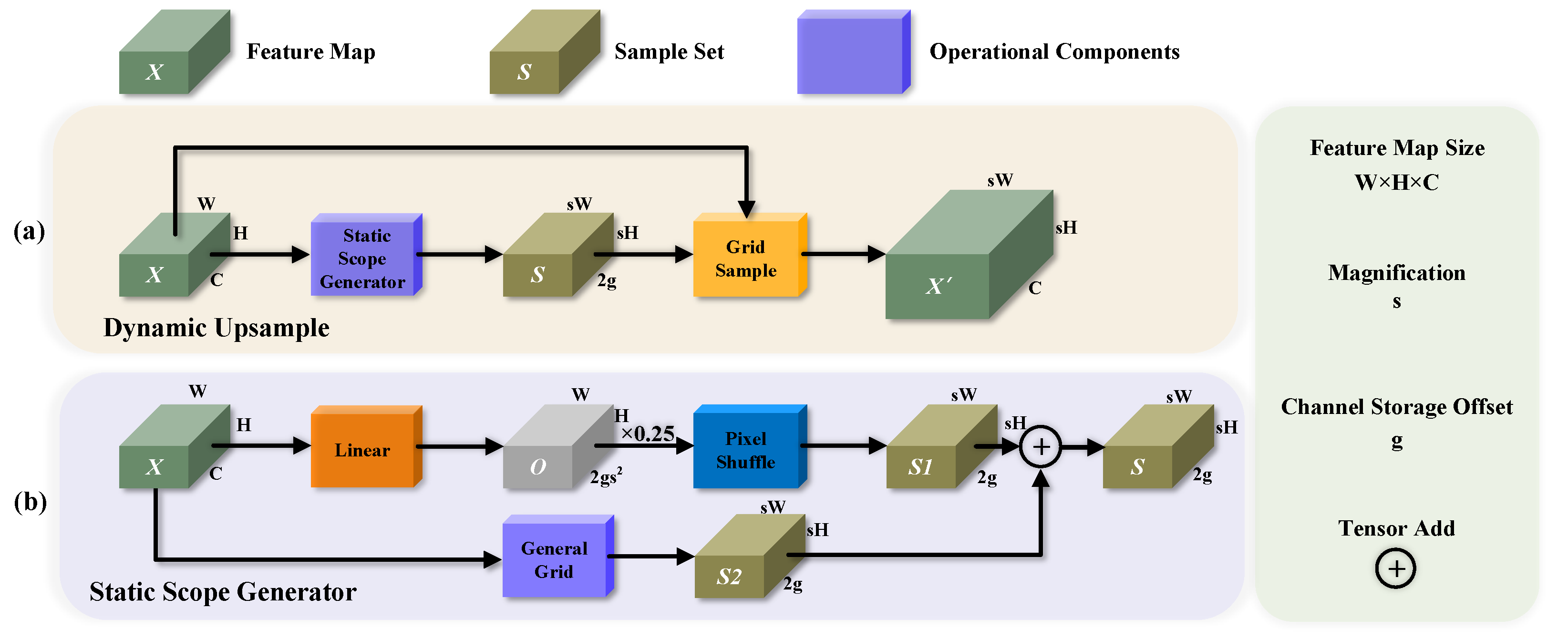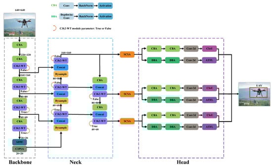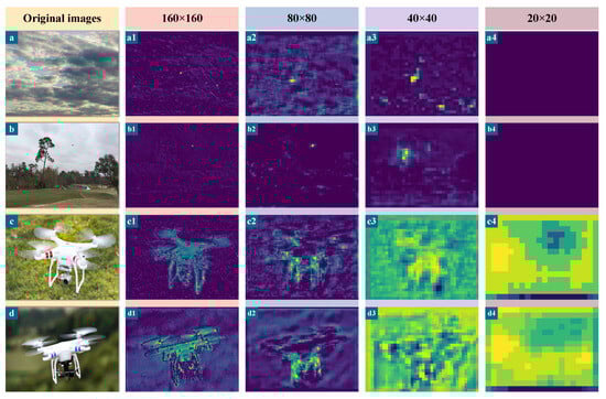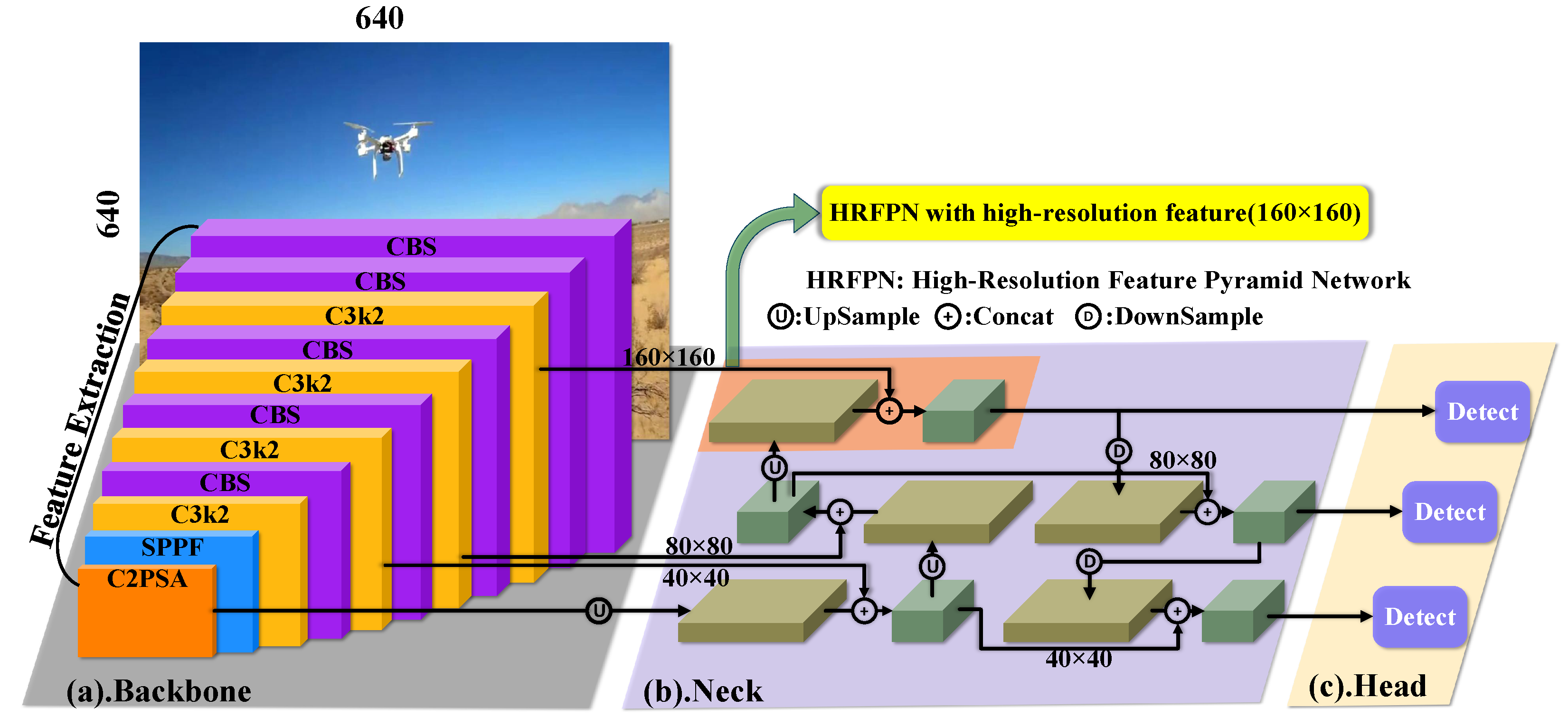 - In the feature fusion stage, high-detail and high-resolution feature maps are obtained through the high-resolution feature pyramid network (HRFPN) and Dysample upsampling. They have more detailed information about small UAVs, which help improve UAV detection performance after information fusion.