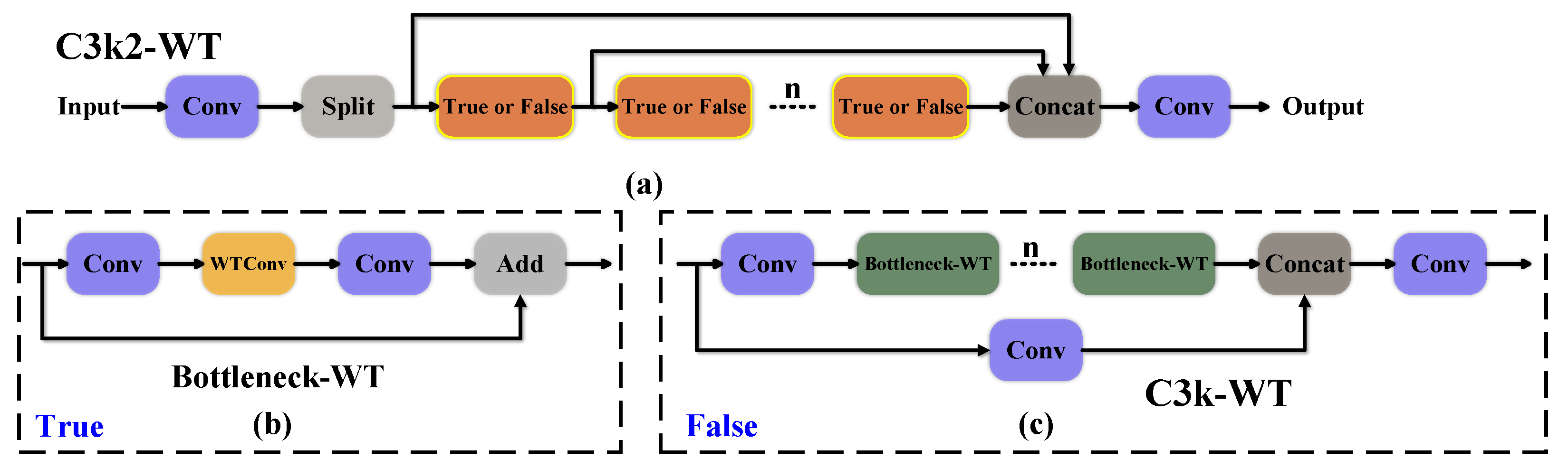 - In the feature extraction stage, feature extraction is enhanced through a C3k2-WT module that integrates wavelet transform convolution (WTConv). It can extract features of different frequencies through small kernel filters. Furthermore, it increases the receptive field of the model without excessively increasing parameters.