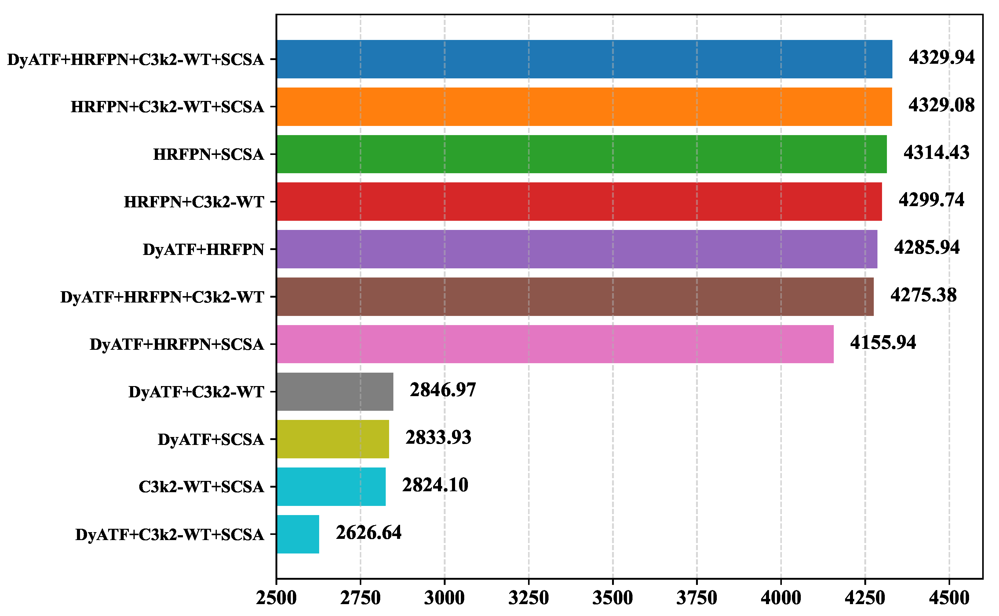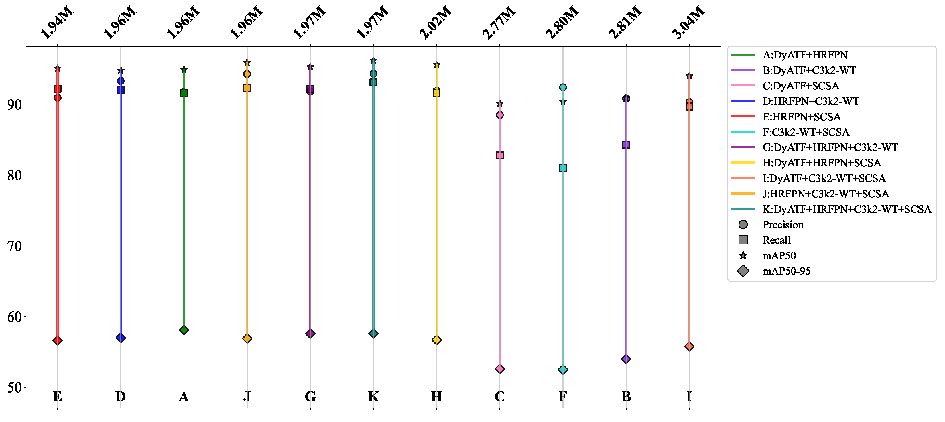 - The full integration of HRFPN + C3k2-WT + SCSA + DyATF yields the highest precision, recall, and mAP50, while achieving the second highest mAP50−95.