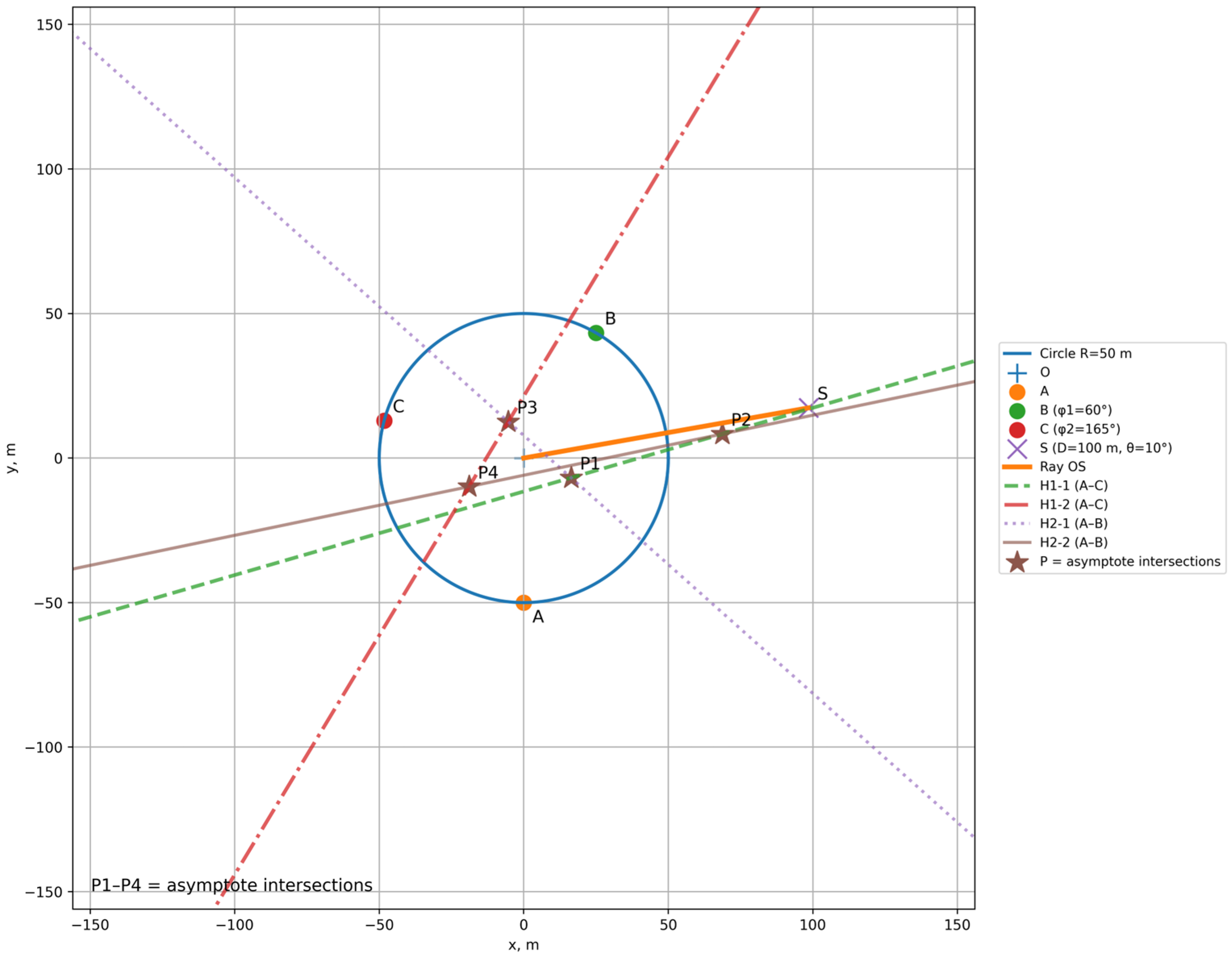 - It proves that the physically correct emitter location is always the asymptote-intersection point farthest from the UAV formation center, while all spurious solutions remain confined near the formation radius.