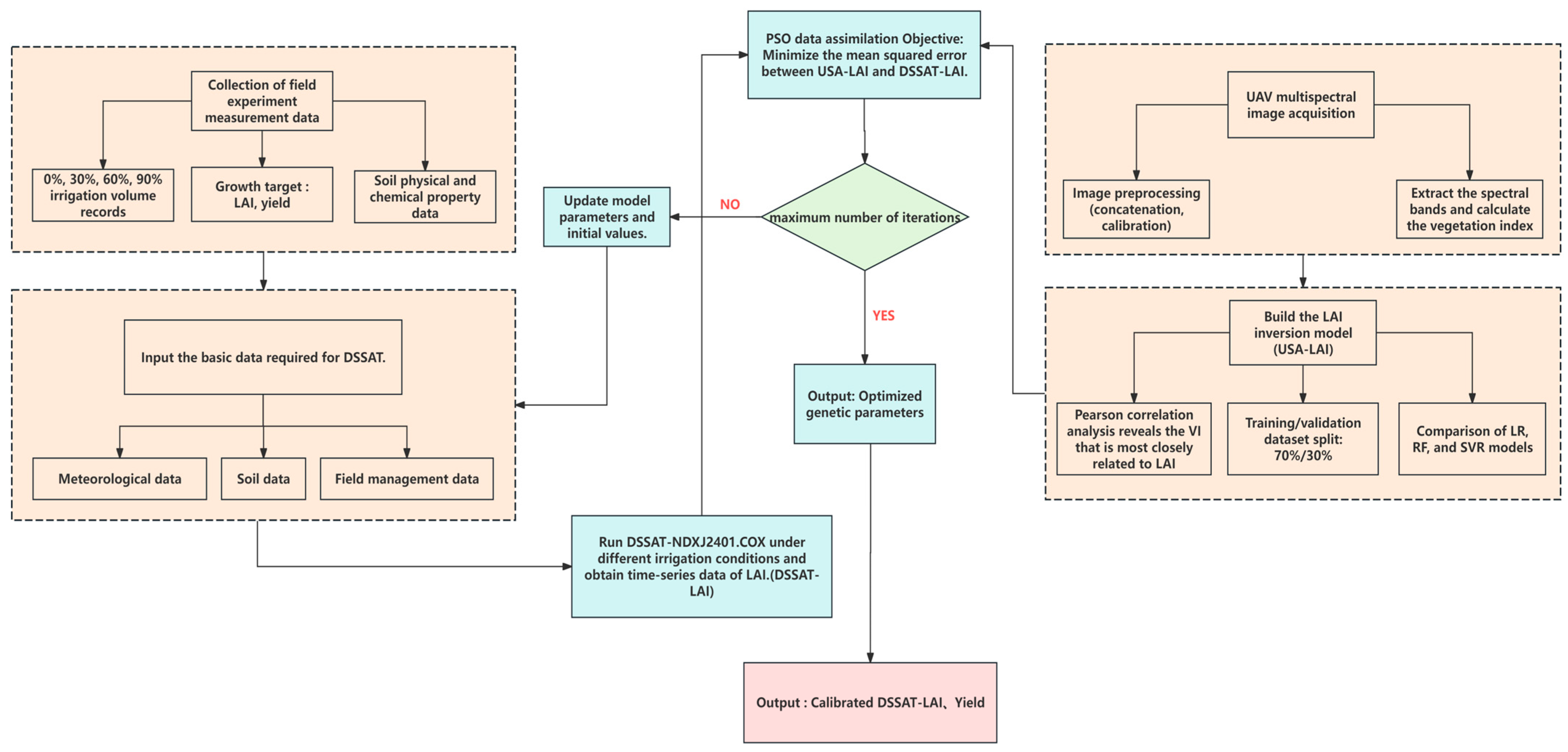 - By integrating LAI data retrieved from a UAS, the simulation bias of cotton yield in the DSSAT model can be dynamically corrected, reducing the yield prediction error from 40–52% to approximately 5%.
