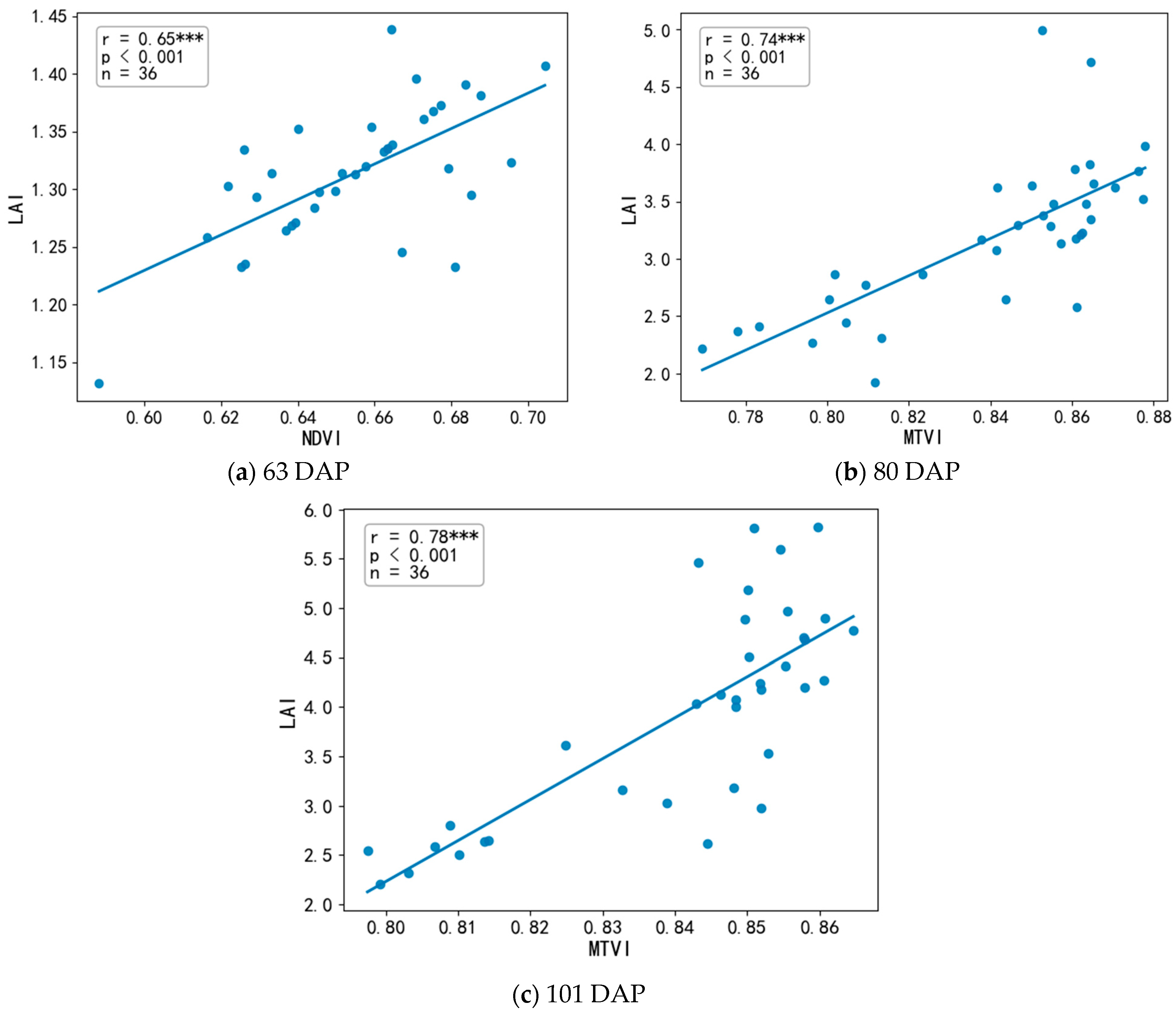 - The NDVI exhibited higher estimation accuracy for cotton LAI during the early growth stage (R2 = 0.56, p < 0.05), whereas the MTVI and EVI demonstrated higher and more stable accuracy in cotton LAI estimation during the late growth stages (R2 = 0.64 and R2 = 0.76, p < 0.05).