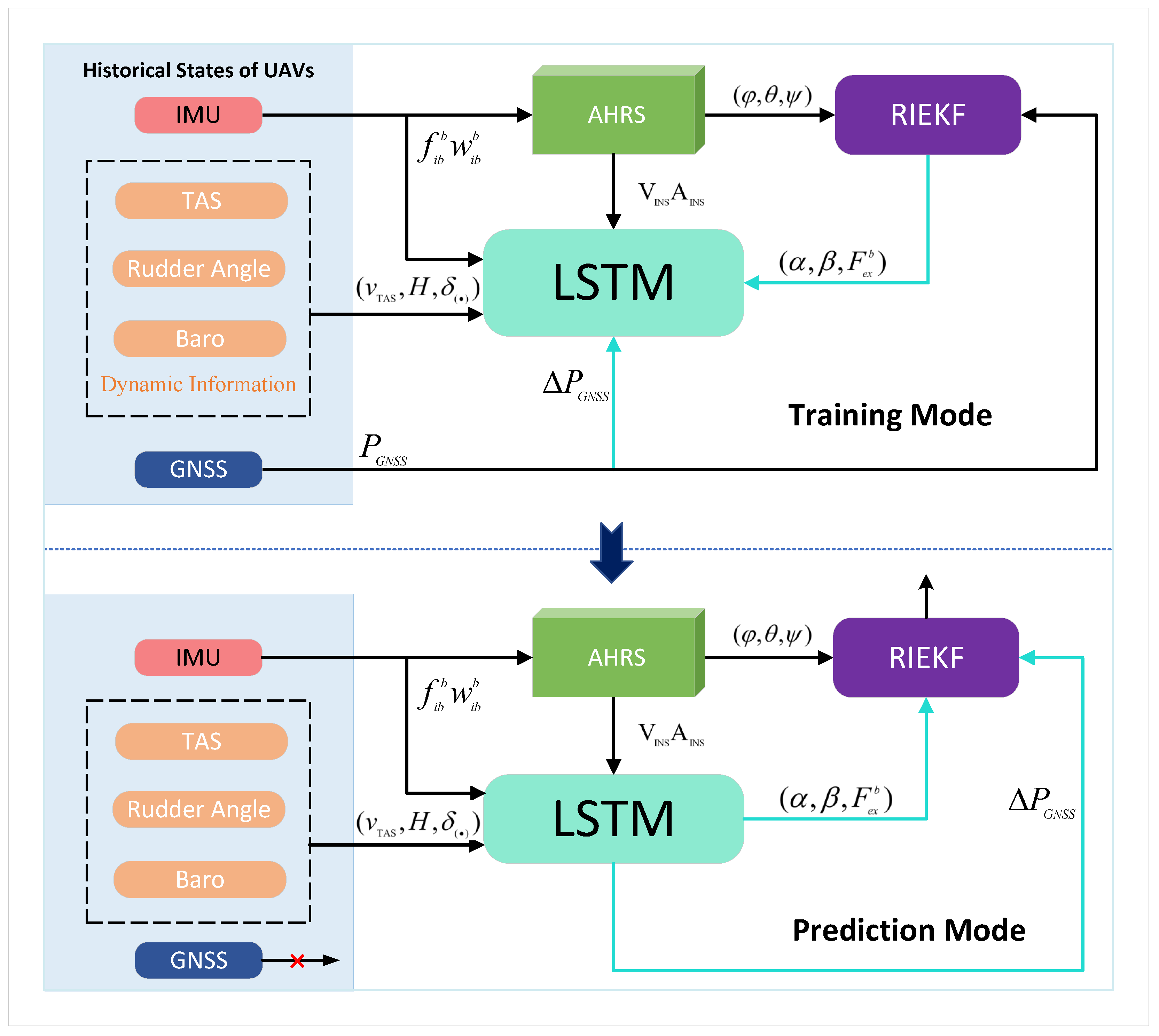 - This paper proposes an LSTM-based complementary cooperative prediction framework integrating airflow-angle prediction with the - scheme under GNSS-denied. The predicted airflow-angle correction facilitates mitigating drift accumulation and improving the stability of state estimation, while the concurrent use of P-GNSS observations imposes closed-loop constraints on inertial position errors. This dual mechanism effectively suppresses inertial drift, enhances overall navigation accuracy and robustness, and provides a basis for subsequent hierarchical fusion and node selection optimization.
