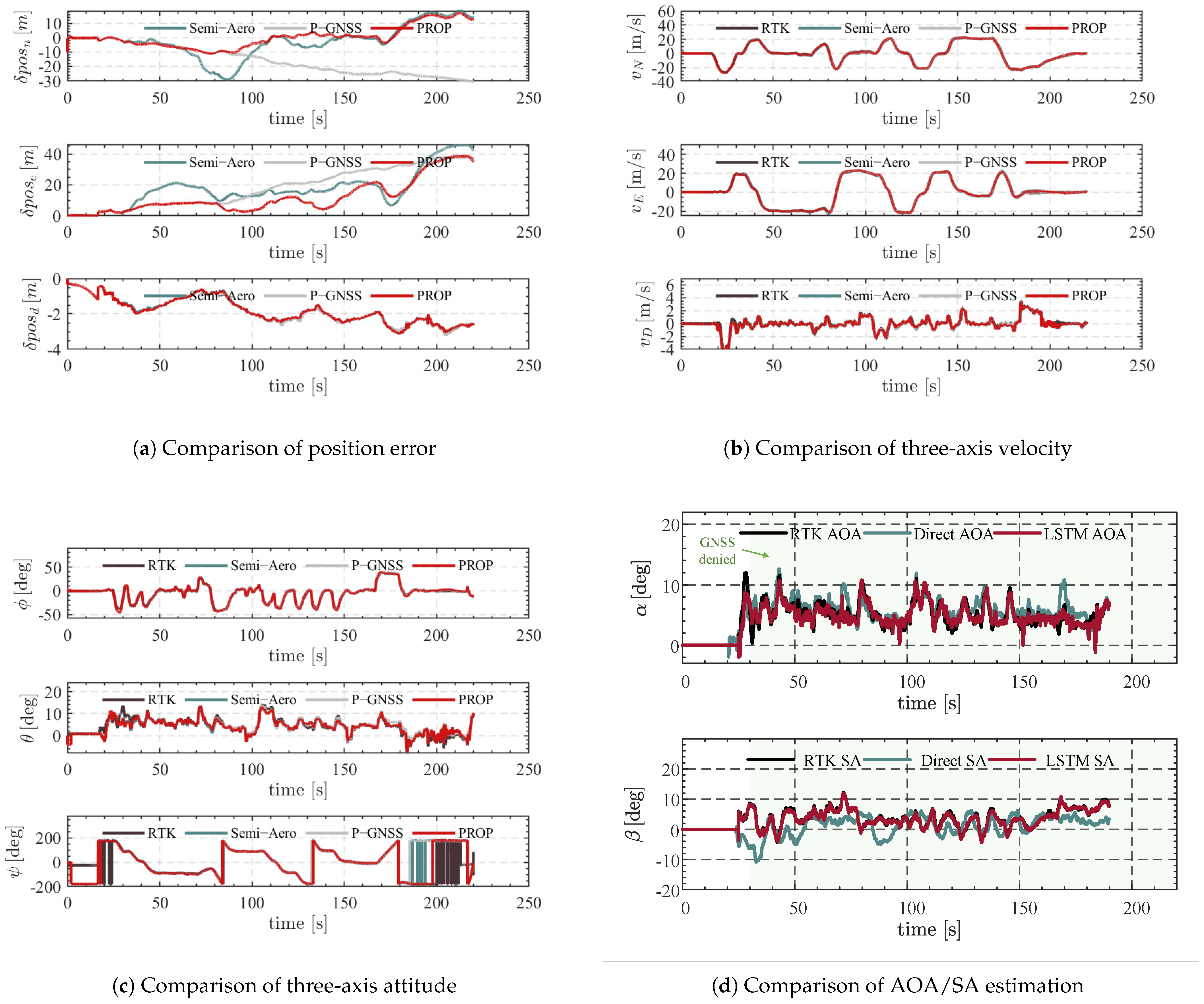 - The proposed cooperative navigation framework based on LSTM and dynamic model information fusion integrates airflow-angle prediction with the - scheme to suppress inertial drift and enhance navigation robustness under GNSS-denied.