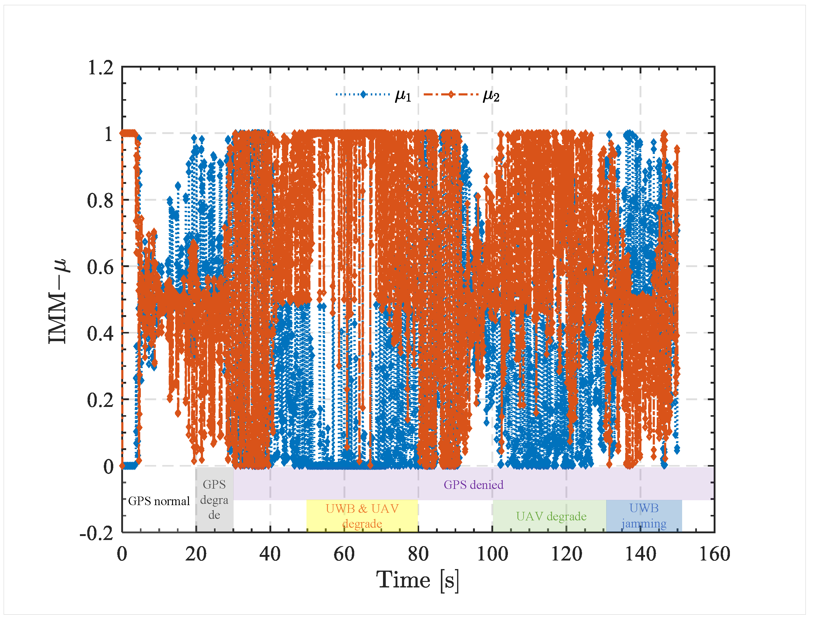 - Building on the consistency-evaluated hierarchical layers, a modified geometric configuration-based IMM filtering algorithm is proposed to flexibly fuse multi-source node information, integrating leader-node multi-sensor data and dynamic model-assisted information such as UWB, wind speed , or external force estimates . This algorithm enhances system robustness under GNSS-denied conditions when facing various contingencies, including UWB outages and leader-node accuracy degradation, and significantly improves navigation accuracy at the follower node layer.