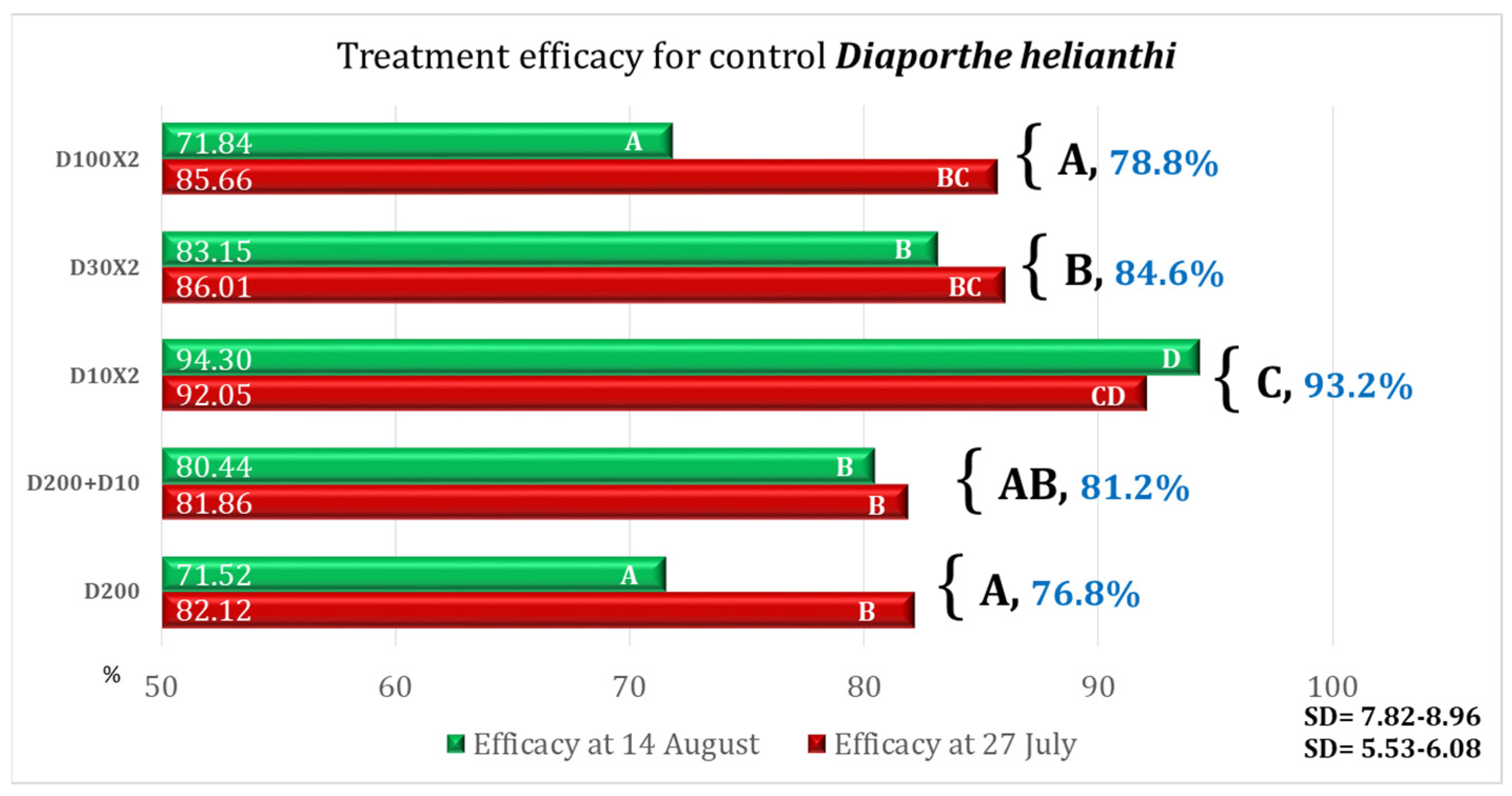 - Dudchenko, V.; Markovska, O.; Sydiakina, O. Determination of the Effectiveness of Fungicide Protection Systems as a Reserve for Sustainable Sunflower Production in South of Ukraine. Technol. Audit Prod. Reserves 2025, 1, 51–57. [Google Scholar] [CrossRef]