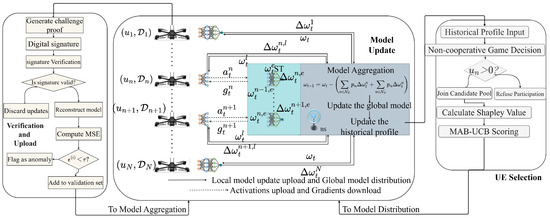 It integrates the exploration–exploitation balance of MAB methods [15], where exploitation favors UAVs with demonstrated high contributions to capitalize on known gains, and exploration engages untested UAVs to uncover potential high-performing devices while also ensuring long term incentive compatibility. Dynamic coalition formation encourages continuous contributions from high-quality devices, here defined as UAV nodes with stable signal to noise ratio reflecting reliable communication with the base station, consistent gradient norms indicating aligned local model updates with the global model direction, valid digital signatures verifying identity authenticity and update integrity, and accuracy improving local model updates that enhance the global model’s performance on the shared test set and effectively suppresses free-riding behavior, which refers to UAVs engaging in non-cooperative actions such as uploading trivial or stale updates like reusing outdated local gradients or submitting low information updates, or benefiting from the global model by downloading and using the aggregated model without performing local computation to avoid resource costs of training. Furthermore, digital signatures are embedded into the selection workflow [16], providing essential identity authenticity and enhancing the overall security of the training process.