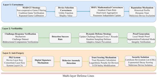 To clarify the practical deployment path of integrating game-theoretic tools into device selection, we elaborate a concrete workflow tailored for UAV networks. Each UAV is pre-configured with a PKI certificate during flight-controller initialization, which binds the device’s identity to its cryptographic keys.The ground base station or multi-access edge computing server distributes split-model segments to selected UAVs; UAVs execute local computations and upload intermediate activations back to the server. Challenge-based verification is triggered periodically during the training process. The BS maintains a real-time trust score for each UAV, which is updated after each training round based on the UAV’s contribution quality, signature validity and communication stability.
