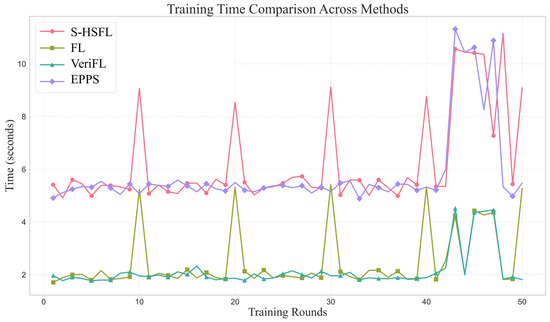 The training time comparison results in Figure 5 reveal that the S-HSFL algorithm successfully controls the growth of time overhead while ensuring high accuracy. Throughout most training rounds, S-HSFL maintains single-round training times within a reasonable range of 5–6 s, representing only approximately 150–200% time overhead increase compared to traditional FL algorithms 2 s [5]. This moderate time increase primarily originates from three computational cost aspects: digital signature generation and verification processes, proof computation within the verifiable mechanism, and dynamic coalition management in the MAB-GT strategy.