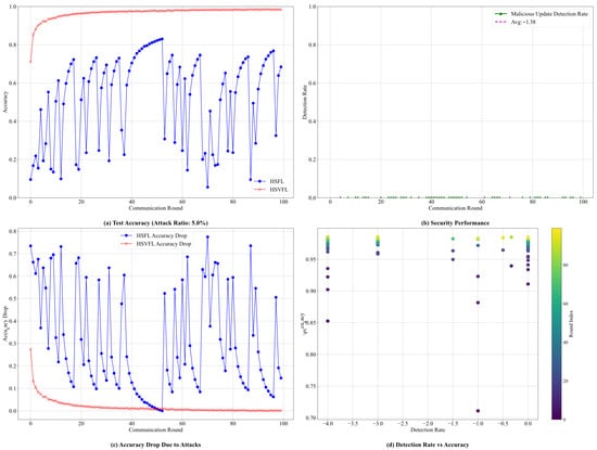 In the scenario with 5.0% malicious users, Figure 8a shows that the HSFL system exhibits relatively stable but periodically fluctuating test accuracy, generally oscillating between 0.1 and 0.8. These variations reflect the intermittent influence of malicious updates. In contrast, HSVFL demonstrates markedly higher stability: its accuracy increases rapidly and remains close to 1.0, indicating that the verifiable mechanism is highly effective under low-intensity attacks. This observation is further supported by the security performance results in Figure 8b, where the malicious update detection rate remains near zero, with an average value of −1.38, suggesting that the system reliably identifies and filters out adversarial behavior in mild attack environments.