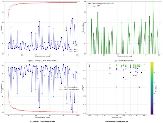 When the malicious user ratio increases to 30.0% (Figure 9), the elevated attack intensity presents a considerably more challenging setting. Under this high-threat scenario, Figure 9a illustrates that HSFL experiences pronounced and irregular accuracy fluctuations, ranging from 0.0 to 0.7, reflecting the susceptibility of traditional federated learning to large-scale coordinated attacks. In contrast, HSVFL maintains strong resilience: although the initial convergence is slower, its accuracy eventually stabilizes above 0.95. Importantly, Figure 9b shows that the malicious update detection mechanism becomes significantly more active under high-intensity attacks, with the average detection rate increasing from −1.38 to −0.29 and with noticeably higher detection frequency and intensity. This demonstrates the adaptiveness of the verifiable federated learning mechanism, which strengthens its defensive behavior as the threat level rises.