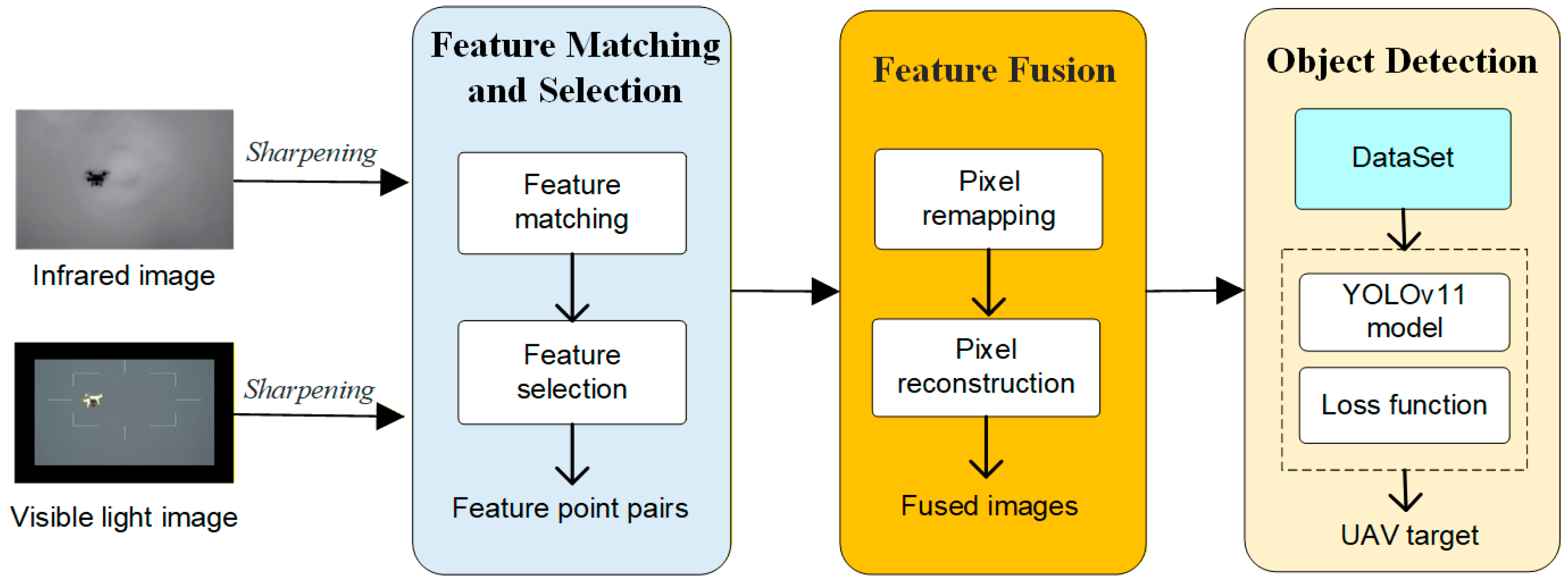 Figure 2 can be summarized as follows: Firstly, the input visible-light and infrared images undergo a sharpening process. An improved speeded-up robust features (SURFs) algorithm is then employed to extract, match, and screen feature points from both modalities. Subsequently, pixel remapping and pixel reconstruction are performed to achieve feature-level image fusion. Finally, target detection is conducted on the fused image using an enhanced YOLOv11 model.