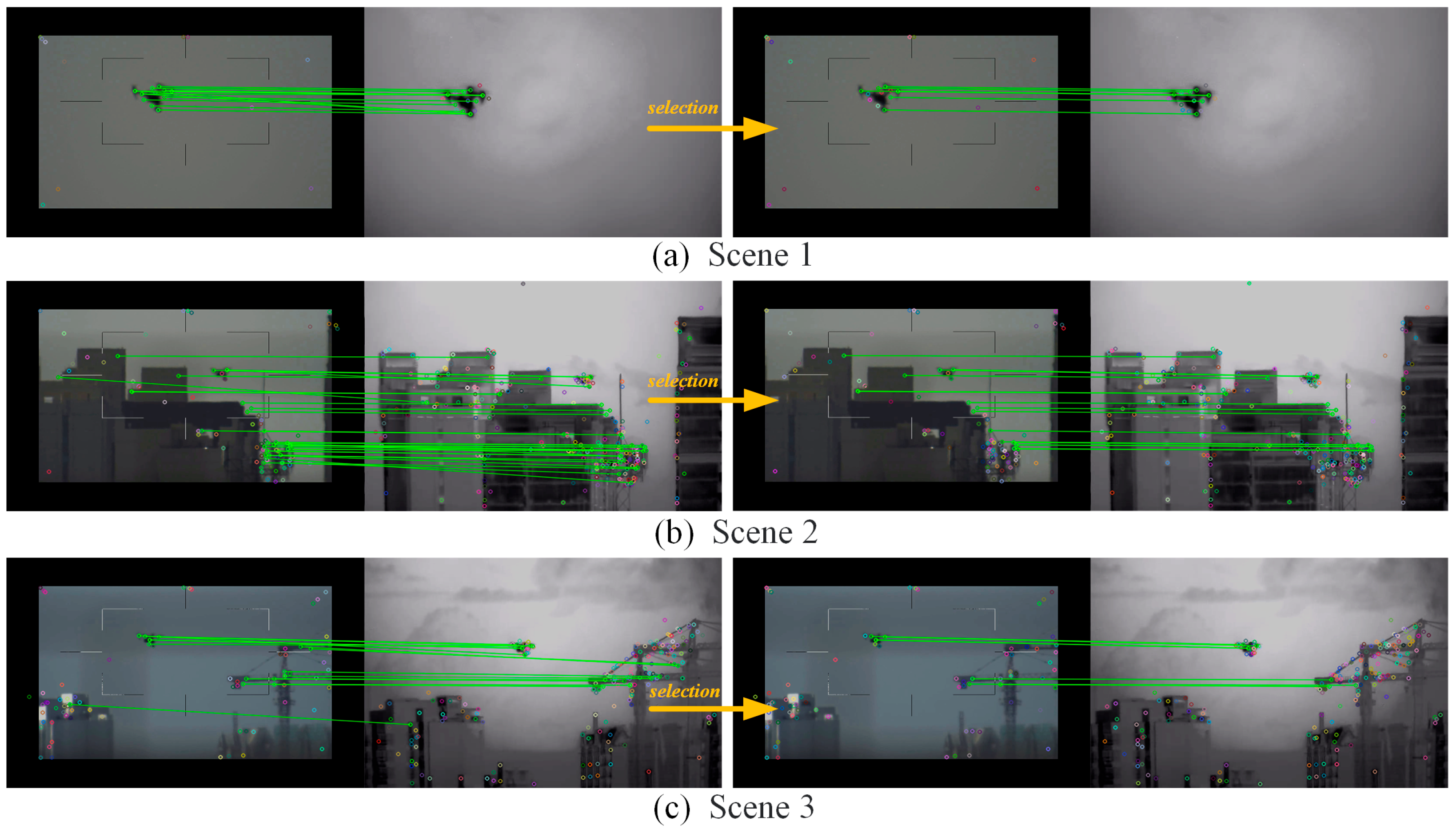 Section 3.1, feature matching and selection were conducted on three representative images obtained under scenes of diverse background and drone distance, the results were presented in