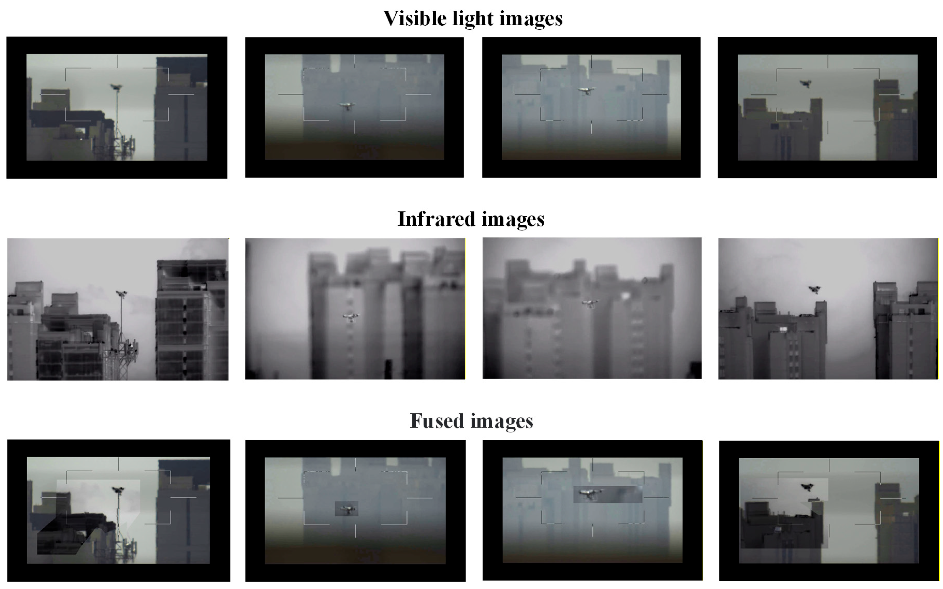 32] released by the University of Chinese Academy of Sciences, which includes over 300 visible–infrared image pairs featuring a variety of commonly available drone models currently on the market. The drones in the dataset exhibit a wide range of flight distances, orientations, lighting conditions (including backlighting), and background environments, with additional inclusion of nighttime scenarios. A key feature of the dataset is its ability to simulate misaligned images captured by a dual-spectrum camera under typical operational conditions. This characteristic makes the dataset particularly suitable for evaluating the performance of the proposed visible–infrared image fusion method.