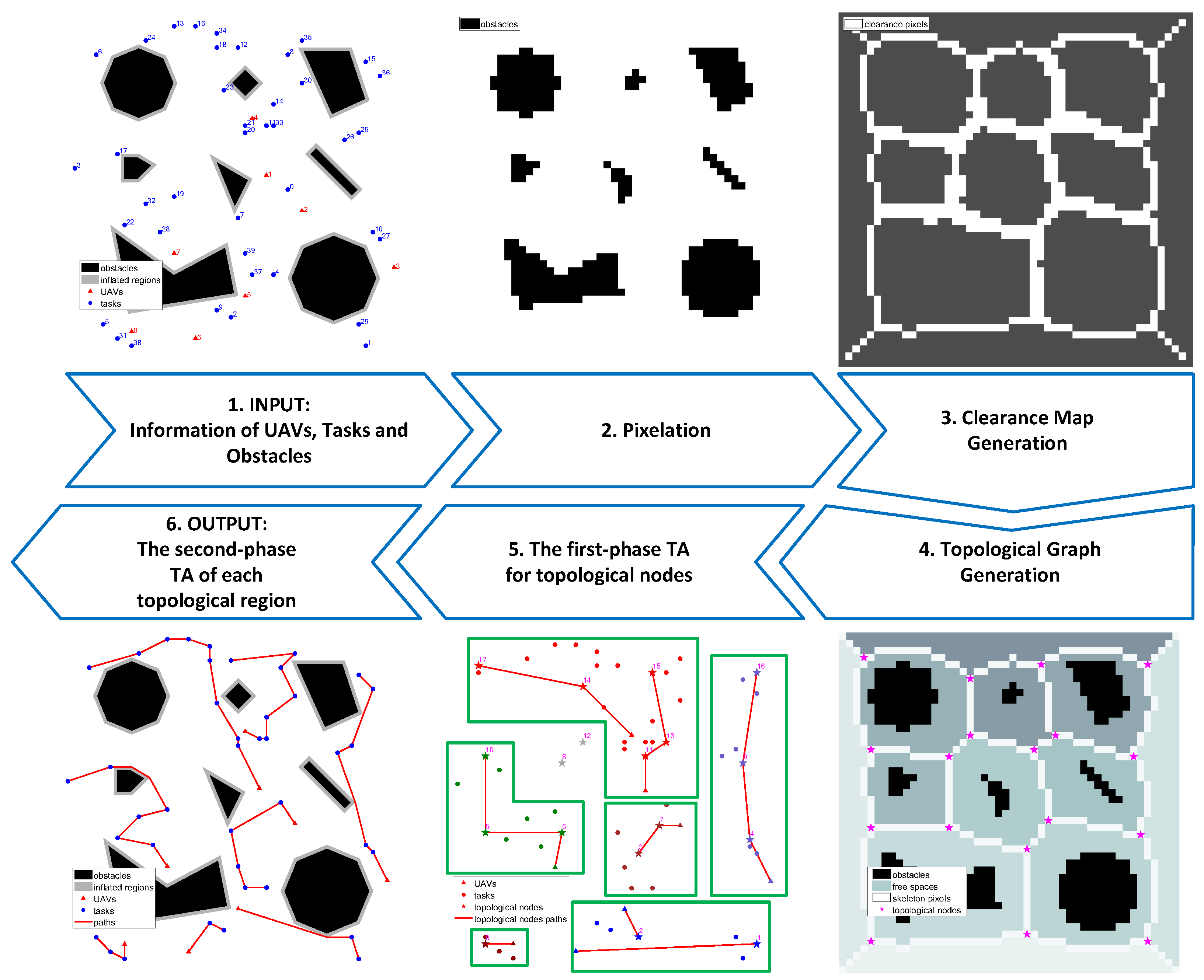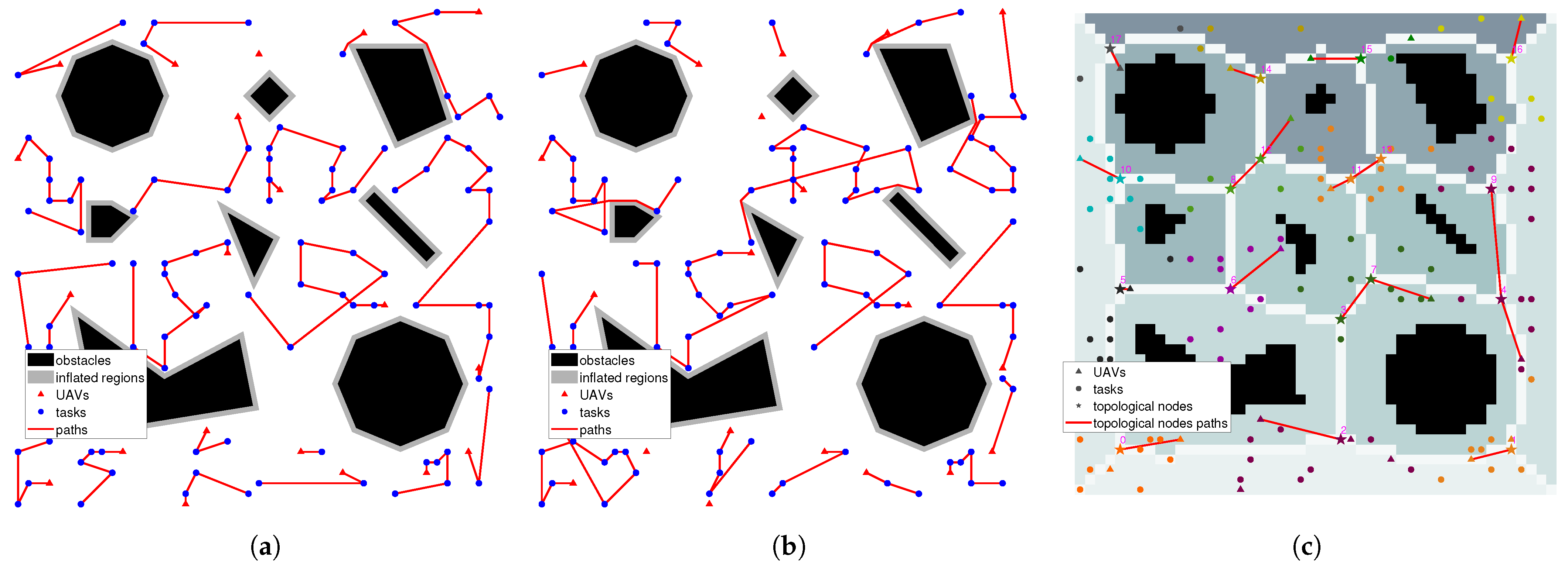 In such cases, considering only the Euclidean distance between task points is insufficient. It is necessary to generate obstacle-avoiding paths within free space and to account for the allocation of a topologically constrained spaces among the UAVs. Bai et al. [