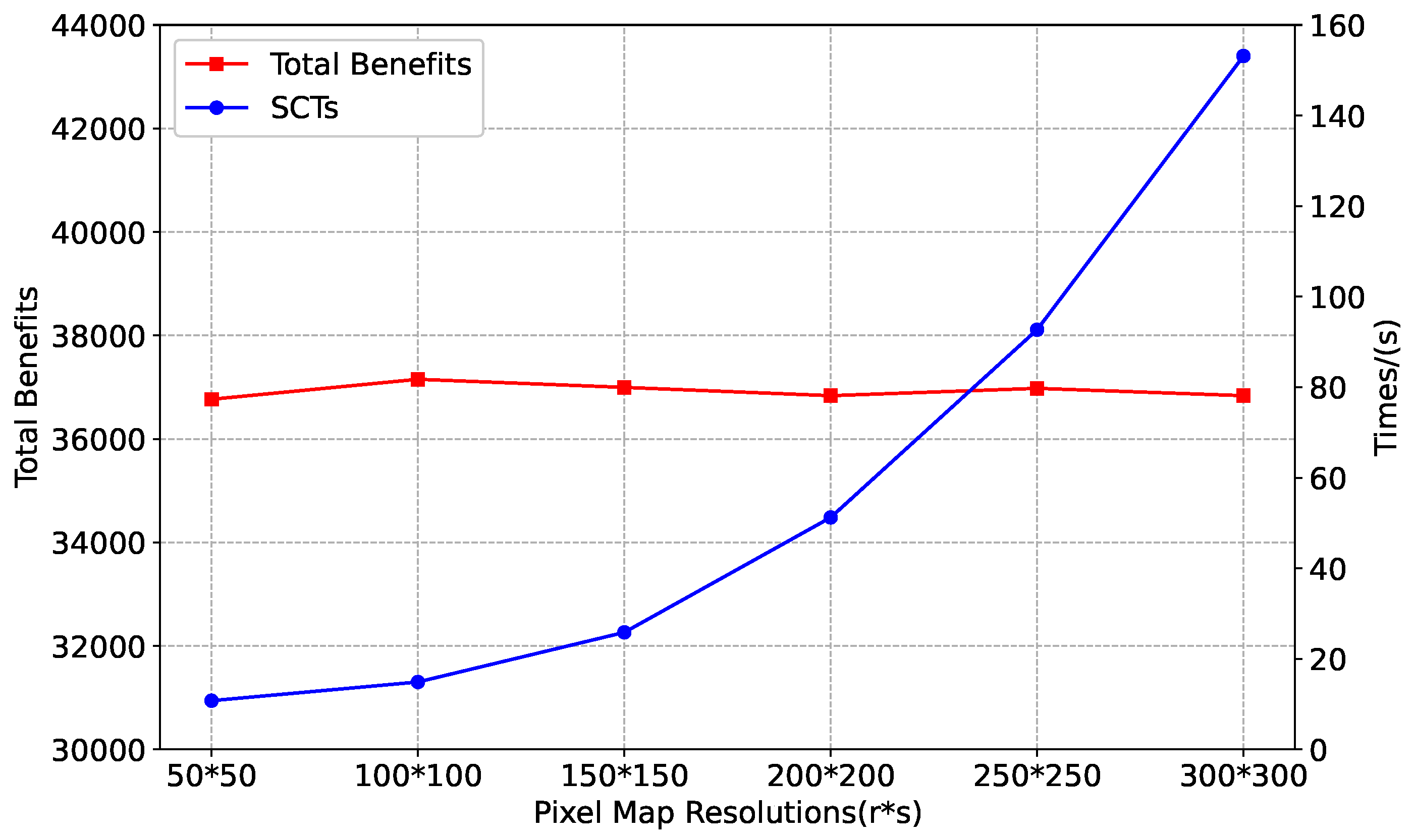 Figure 2. In the figure, the red square line represents the benefit curve, while the blue circular line represents the SCT curve. It can be clearly observed that the benefit obtained by the proposed method remains approximately consistent as the pixel map resolution increases. Therefore, it can be concluded that the optimization objectives of the proposed method are largely independent of pixel map size, demonstrating strong robustness to variations in pixel resolution. However, SCT increases continuously with increasing pixel map size, which is consistent with the computational complexity of