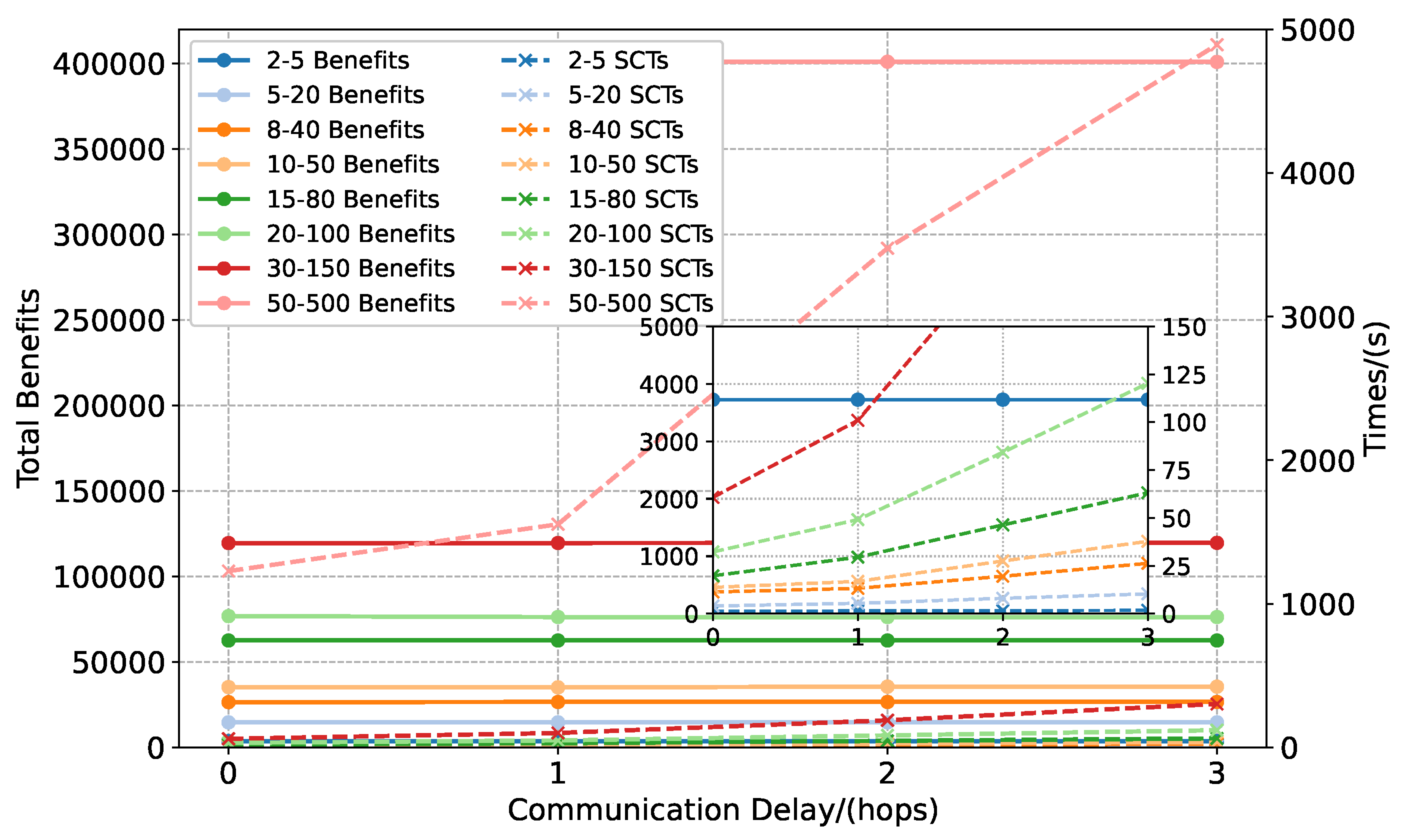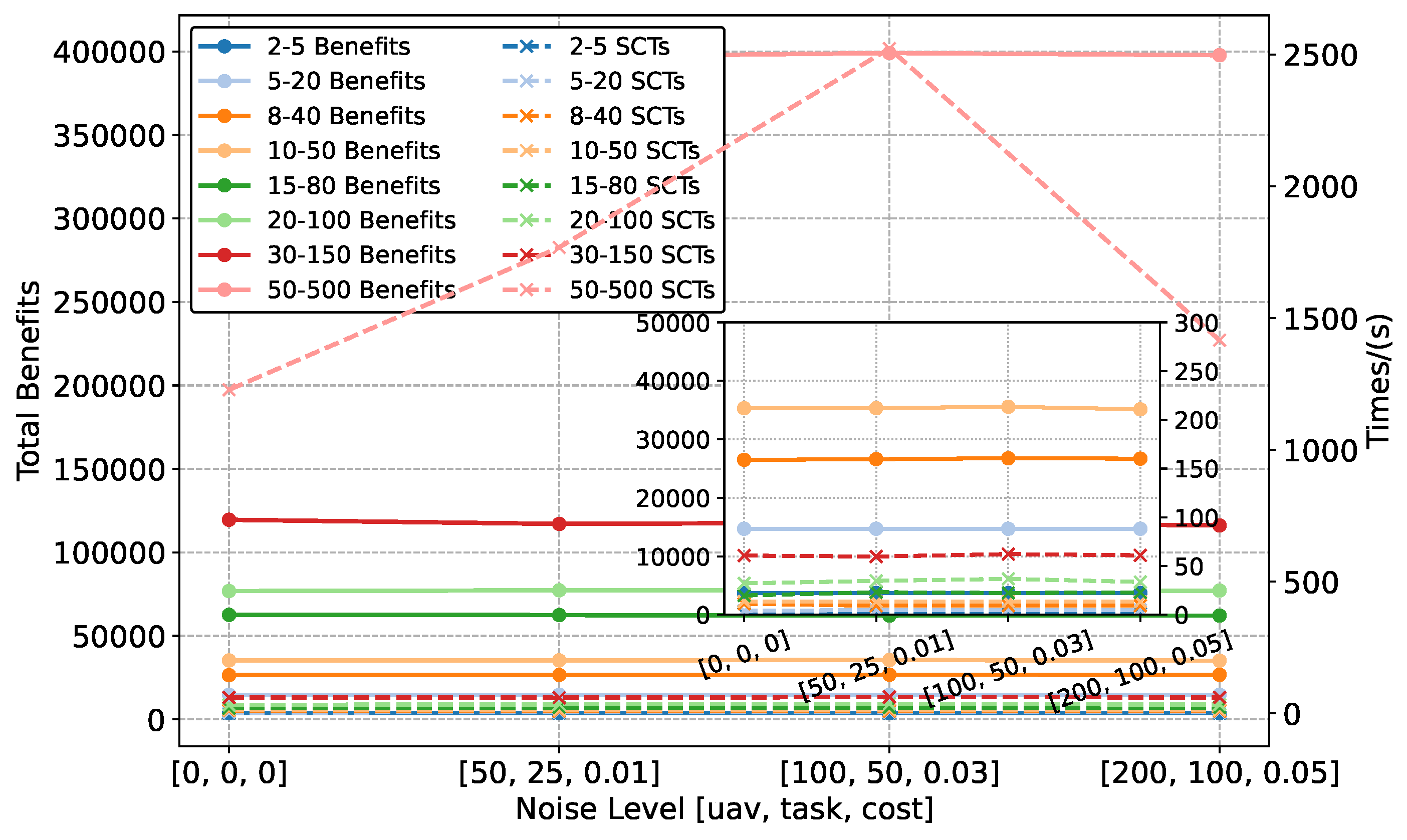 Figure 5, the solid lines with circular markers represent the benefits obtained under different simulation scales, whereas the dashed lines with cross markers denote the corresponding SCTs. As shown in