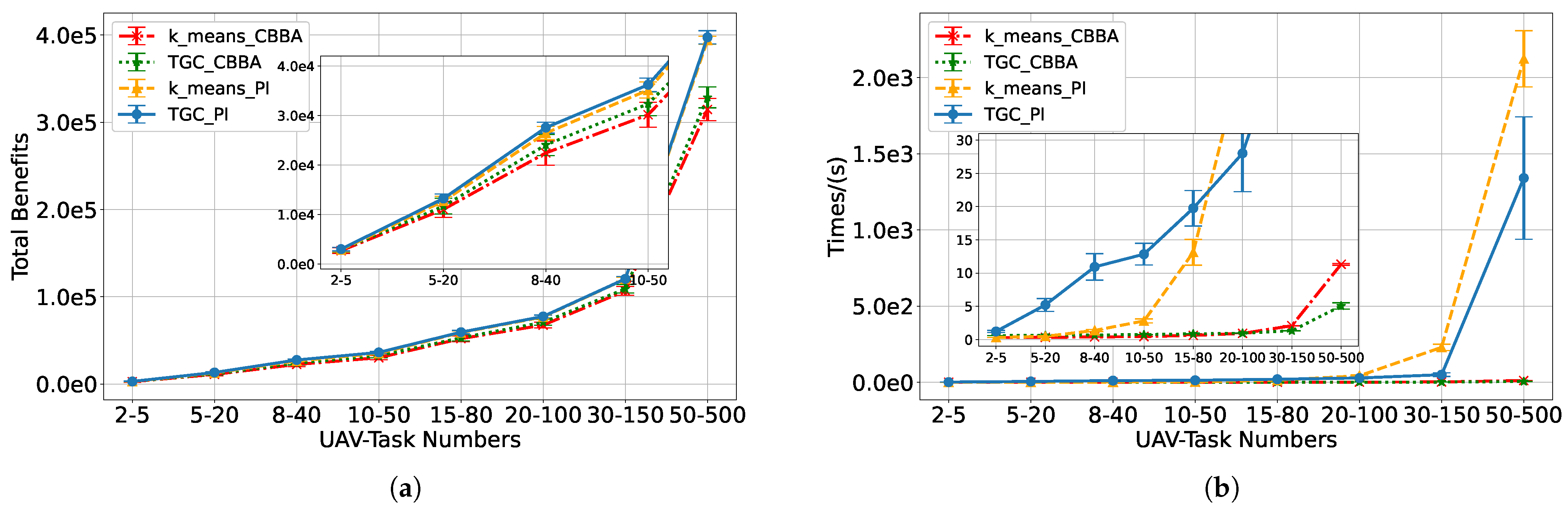 To further validate the proposed method, CBBA is also included in the experiments, resulting in four methods for comparison: TGC-PI, k-means-PI, TGC-CBBA, and k-means-CBBA. In this subsection, repeated experiments and statistical analyses are conducted for different numbers of UAVs and tasks, where the number of UAVs and tasks increase simultaneously while their ratio gradually increases. The simulation results are presented as error bar plots in