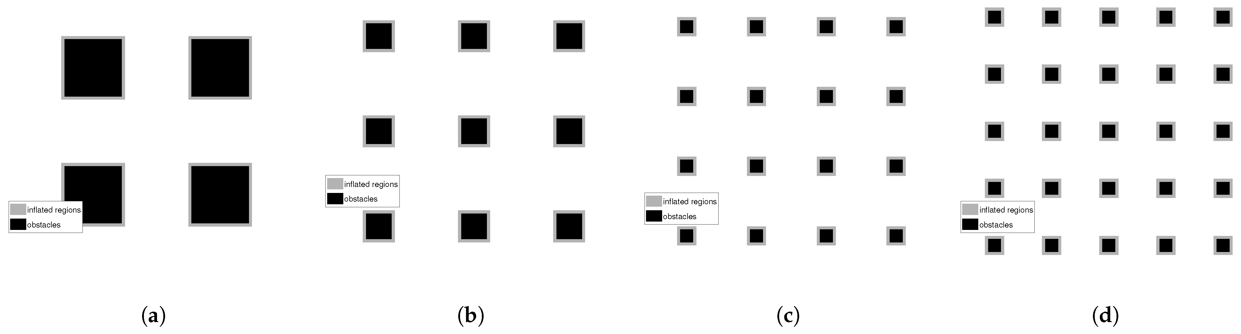 Figure 7 illustrates the environments corresponding to the different obstacle configurations. This set of experiments primarily investigates the impact of obstacle density—corresponding to different levels of topological complexity—on the performance of the proposed method; therefore, no additional design is applied to the shapes or arrangements of the obstacles.