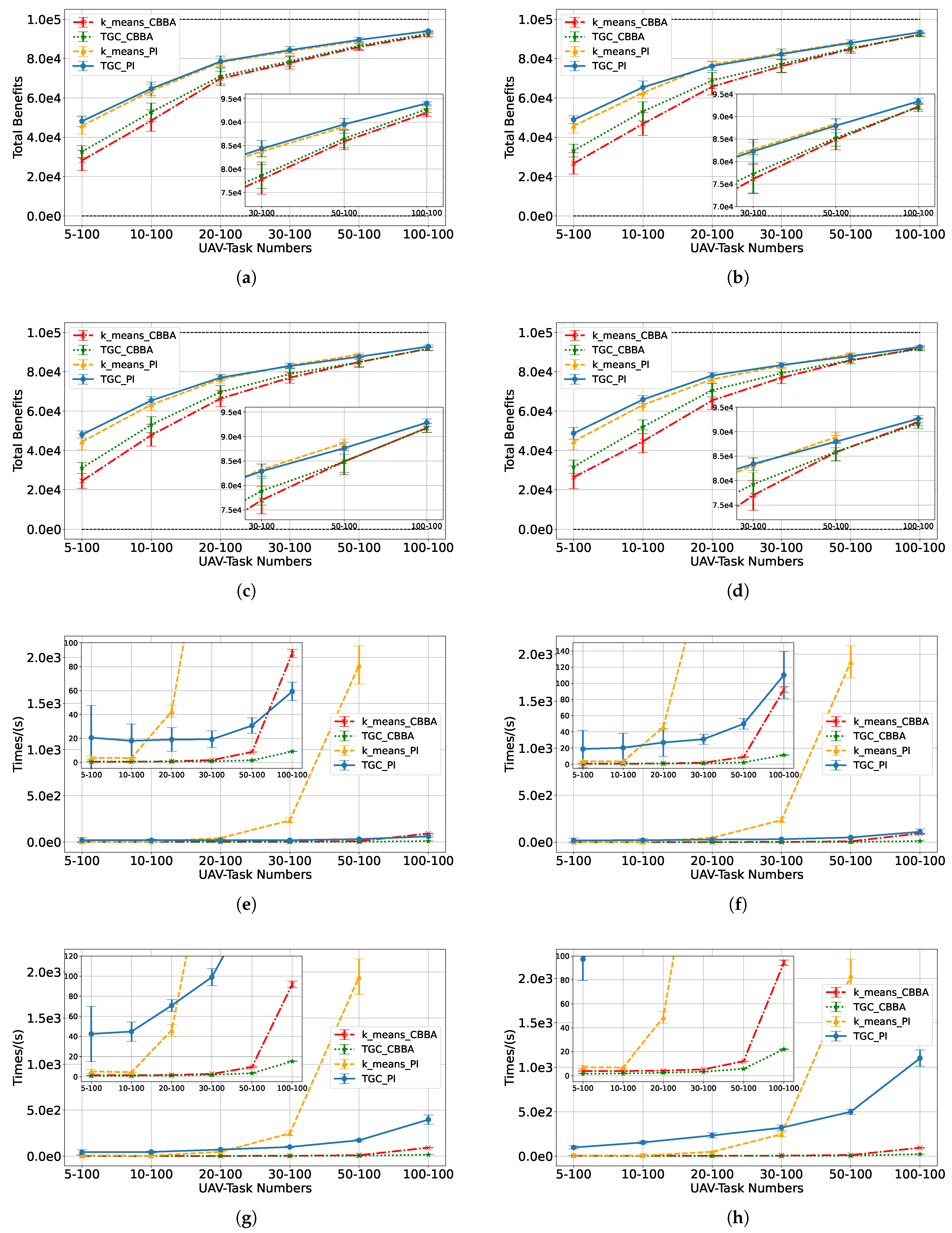 Figure 6b indicate that, in small-scale scenarios (smaller than 15–80), TGC-PI requires more computation time than k-means-PI, whereas in large-scale scenarios, TGC-PI demonstrates a clear advantage. A similar trend is observed for the CBBA-based methods: in small-scale scenarios (smaller than 20–100), the SCTs are comparable, with both methods exhibiting average computation times of less than 2