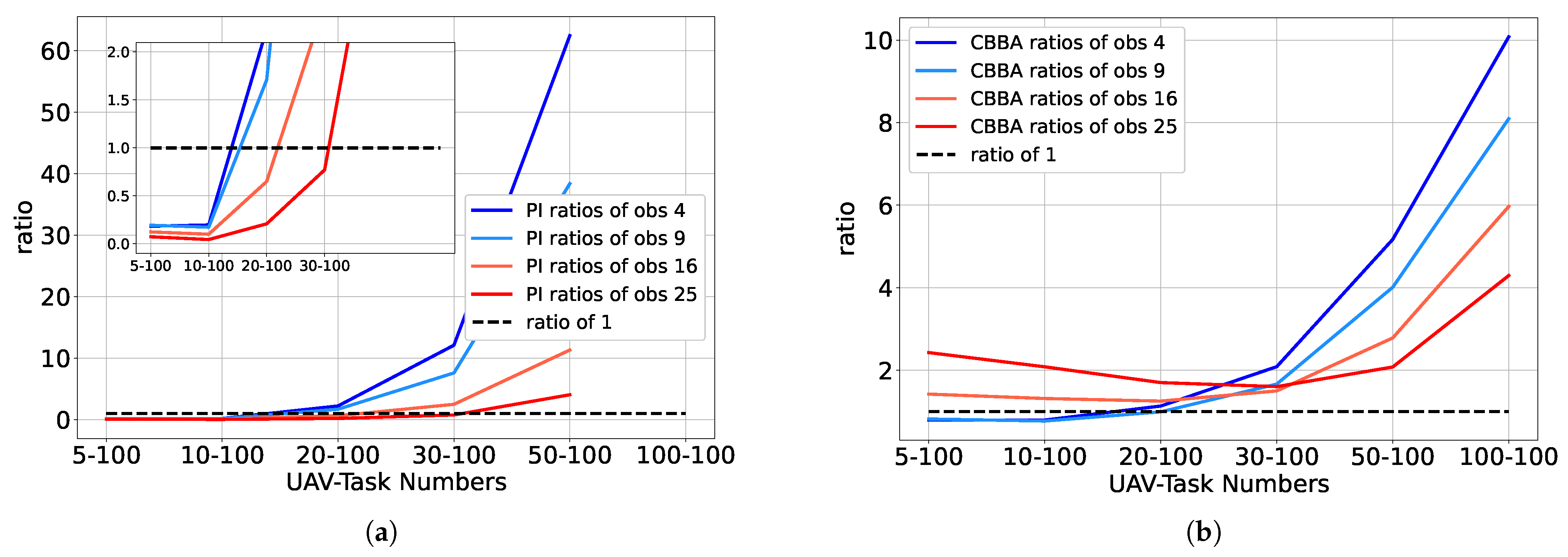 Furthermore, repeated simulation experiments are conducted in environments with varying numbers of obstacles. Specifically, the number of obstacles is set to 4, 9, 16, and 25 and arranged in a square grid, while the number of UAVs varies among 5, 10, 20, 30, 50, and 100, with the number of tasks fixed at 100.
