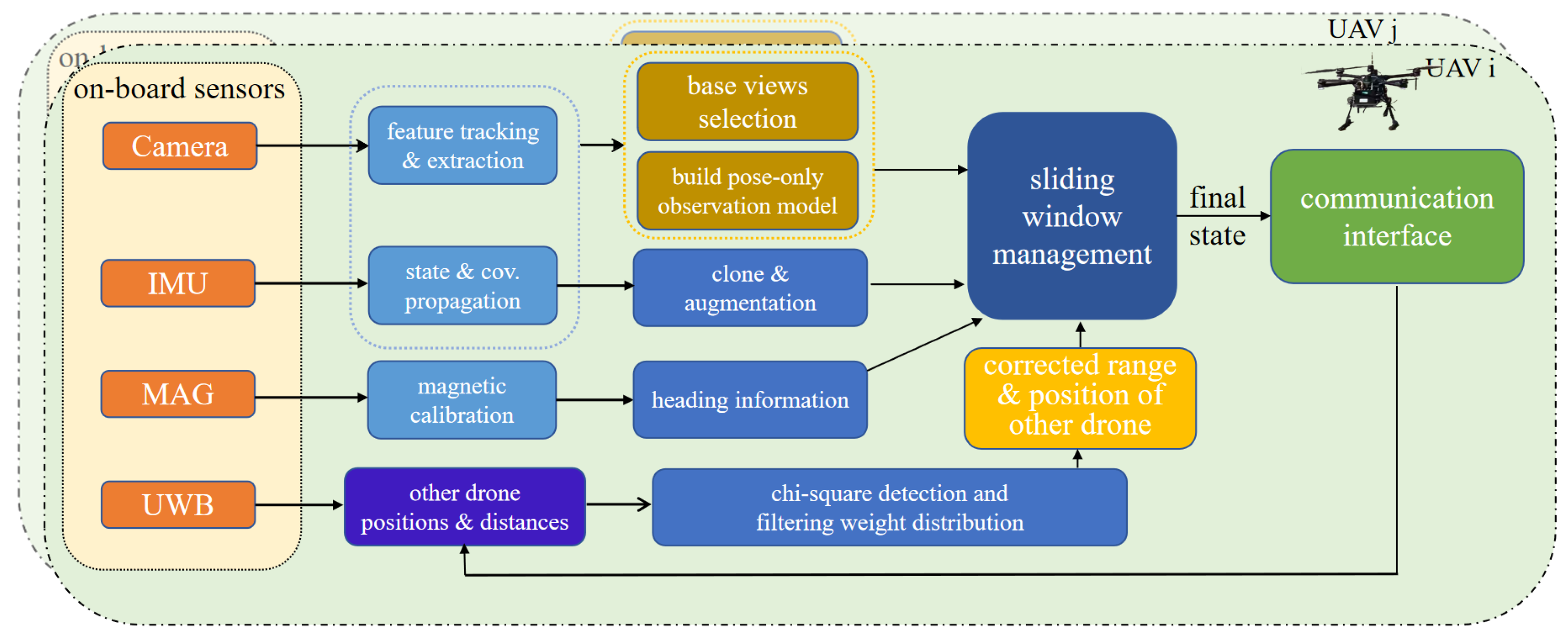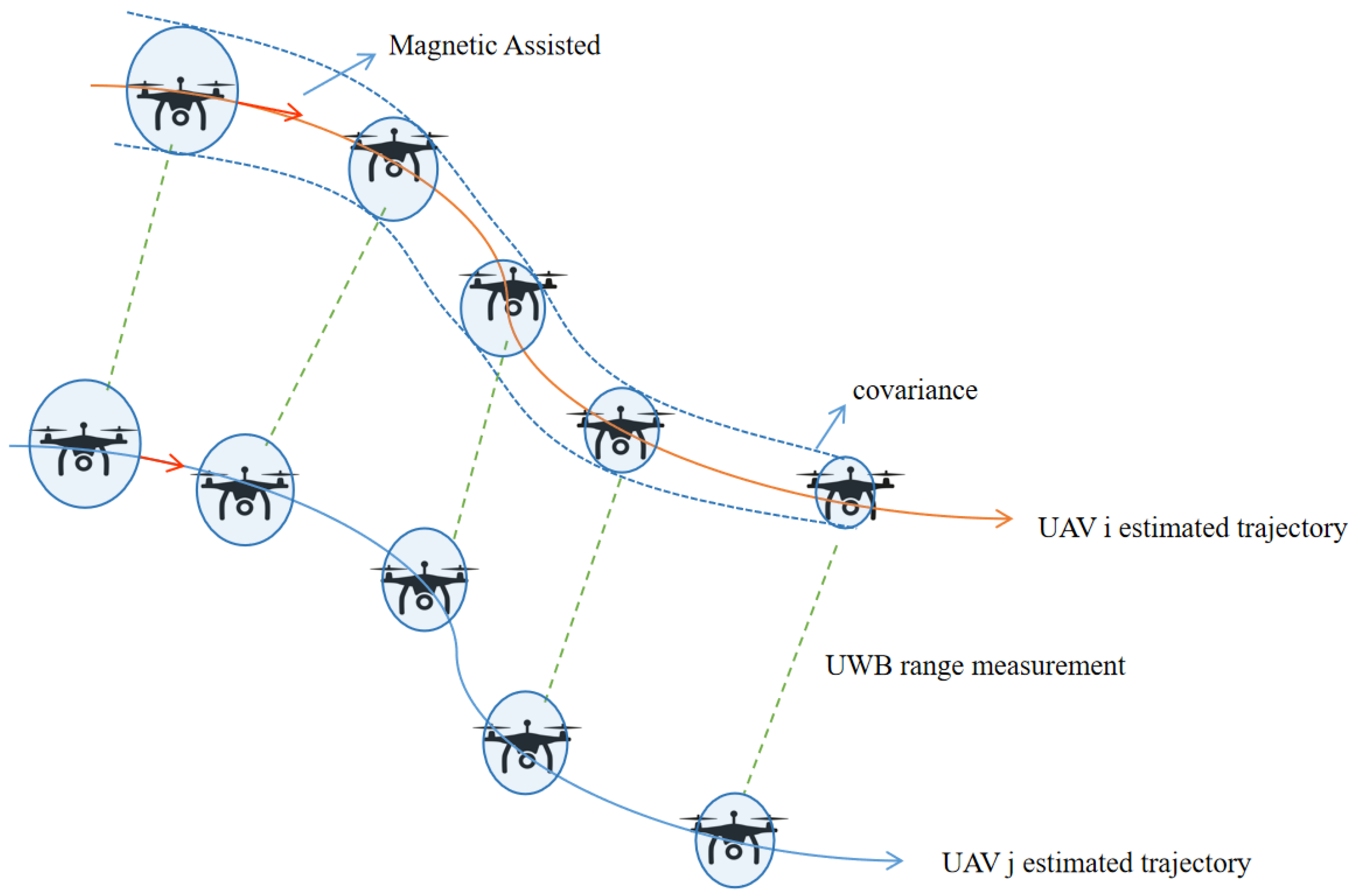 Therefore, considering the requirements of low cost, lightweight, and real-time performance, we propose a distributed anchorless vision-inertial-UWB-magnetic multi-drone collaborative positioning system. UAVs measure the distance between drones through UWB. There is no need to rely on UWB anchors, and a filtering framework based on EKF is used to fuse multiple observations, which enhances the lightweight and real-time nature of the algorithm. In order to further improve the accuracy, we incorporate multiple UWB key frames into the sliding window, and adopt an adaptive adjustment method for filtering errors based on chi-squared detection. In addition, in terms of vision observation, we adopt a visual observation model based on PO constraints, which improves the system’s adaptability to challenging visual environments.
