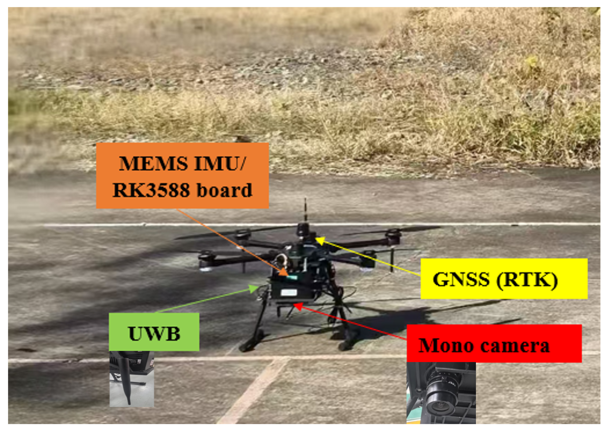 Figure 6, which mainly includes the following modules: (1) Vision module: Equipped with FLIR Blackfly S USB3 global shutter camera, microsecond time synchronization between IMU and camera is achieved through hardware trigger signals (FLIR Systems, Inc., Wilsonville, OR, USA). (2) Inertial module: MEMS-IMU is used to output 200 Hz raw data of gyroscope, accelerometer, and magnetometer (Ruiyan Xinchuang Technology Co., Ltd., Chengdu, Sichuan, China). (3) UWB module: The ranging frequency is 10 Hz, and the accuracy of 0.3 m in dynamic environments is achieved through TDoA technology (Air Recycling Technology Co., Ltd., Shenzhen, Guangdong, China). (4) RTK positioning module: Integrated RTK-GNSS module (positioning accuracy of 2 cm) as a truth reference and is only enabled during the algorithm evaluation stage (Ruiyan Xinchuang Technology Co., Ltd., Chengdu, Sichuan, China). (5) Main processor: Select the RK3588 (Rockchip Electronics Co., Ltd., Fuzhou, Fujian, China) embedded computing module to meet the real-time computing requirements of the sliding window EKF framework. The parameters of each module are shown in