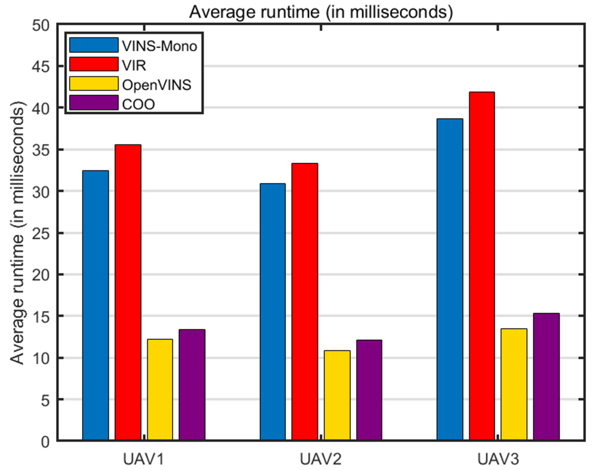 Figure 9 shows a comparison of the running times of different algorithms to evaluate the operating efficiency. It can be seen that our algorithm can maintain high operating efficiency thanks to its lightweight architecture and filter-based advantages. Moreover, the 3588 board (16 GB RAM) on our device runs the algorithm with a memory usage of ≤10% and a CPU usage of ≤30% to meet real-time demands. The system is powered by an independent 12 V/6000 mAh lithium battery, supporting continuous operation for ≥1 h. To sum up, compared with the open source SOTA VIO positioning method and multi-UAV collaborative positioning method, the algorithm proposed in this paper shows excellent positioning performance and computational efficiency.