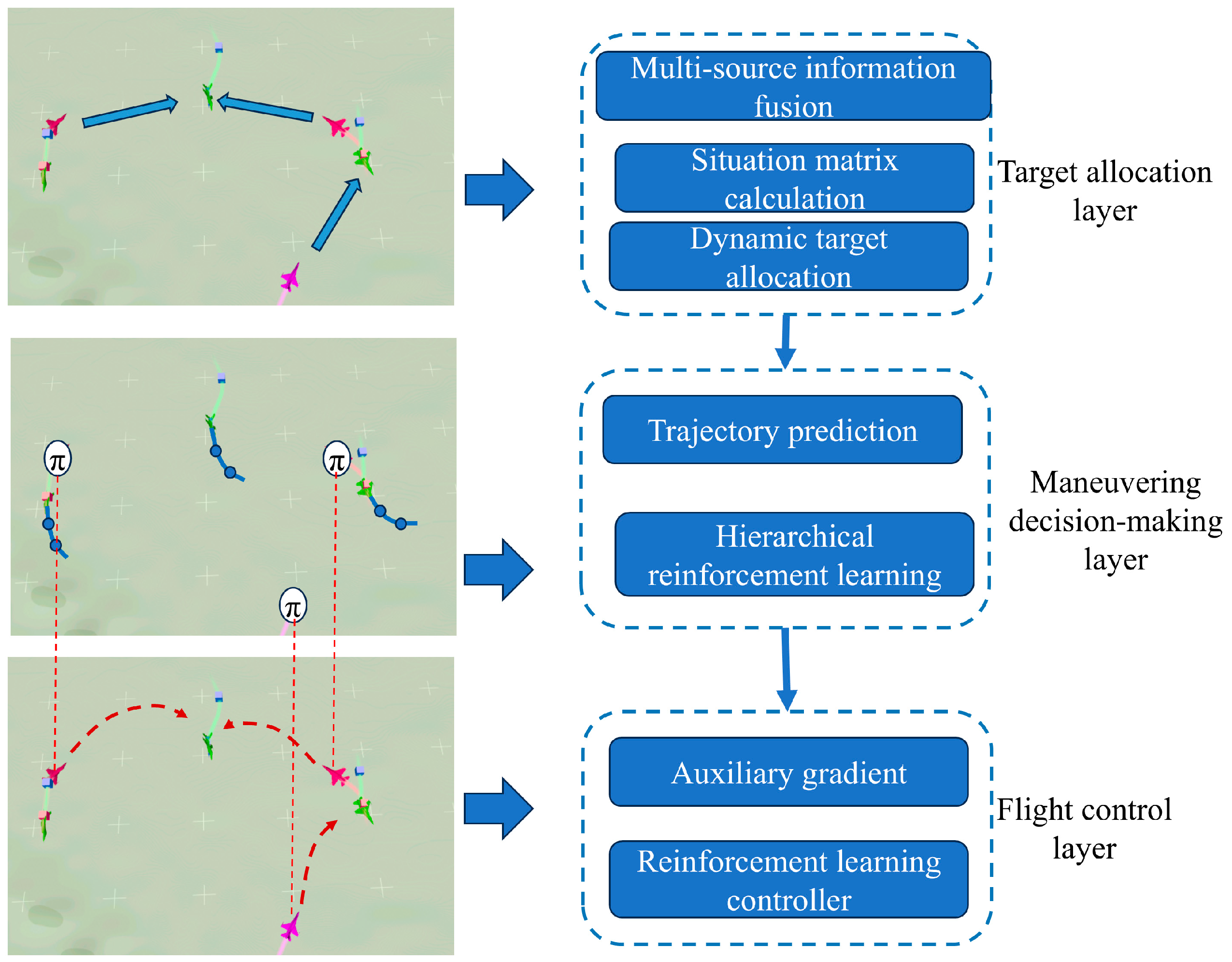 - The hierarchical reinforcement learning method based on trajectory prediction and stable auxiliary gradients effectively improves the win rate and generates a smooth flight path.