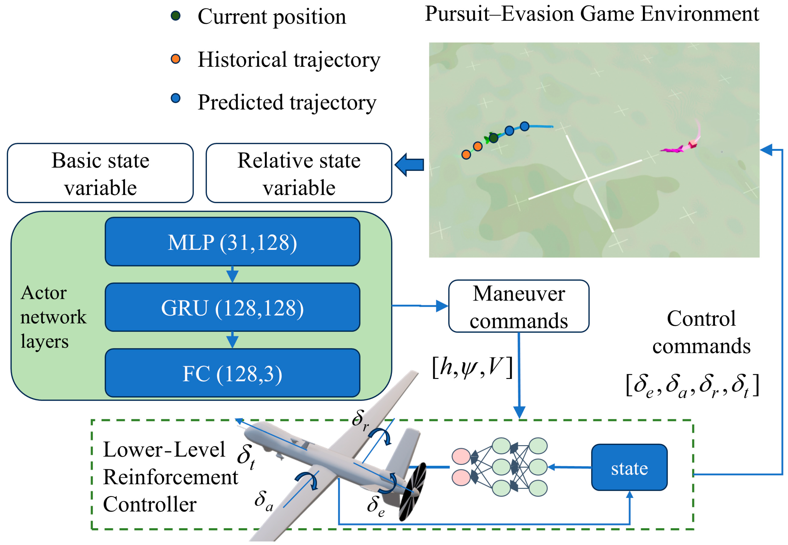 - Zhang, Y.; Zhu, Y.; Wang, J. Gaussian-enhanced reinforcement learning for scalable evasion strategies in multi-agent pursuit-evasion games. Neurocomputing 2025, 652, 131080. [Google Scholar] [CrossRef]