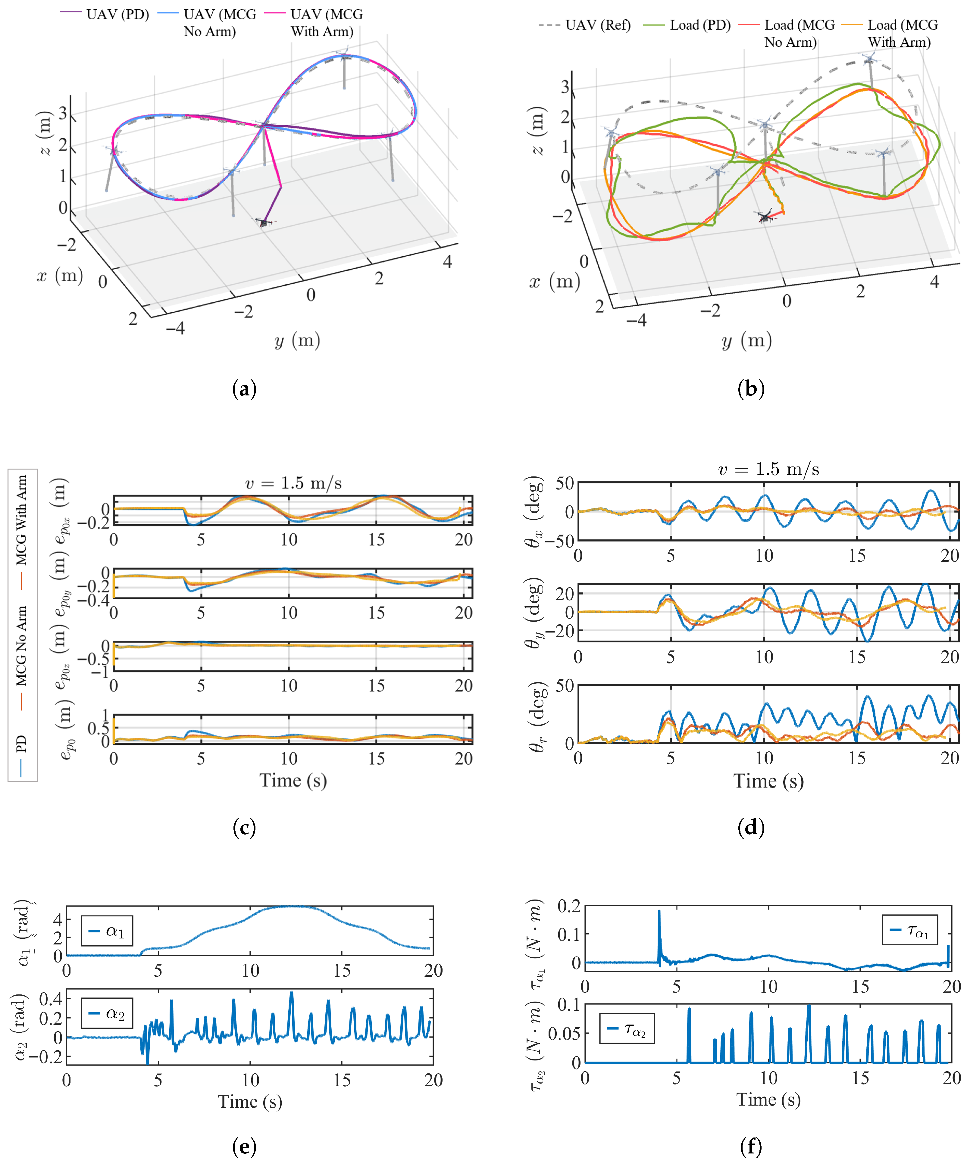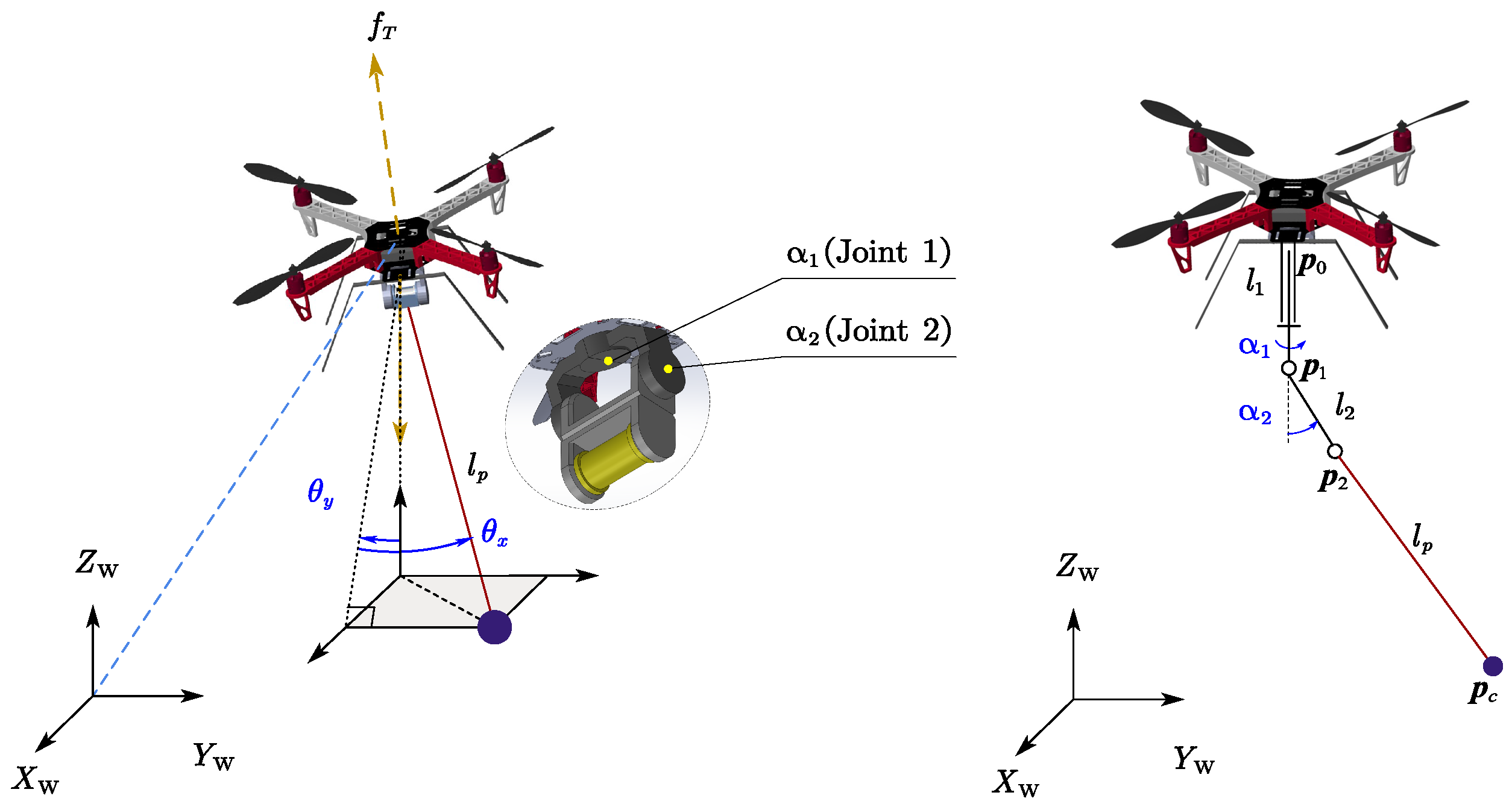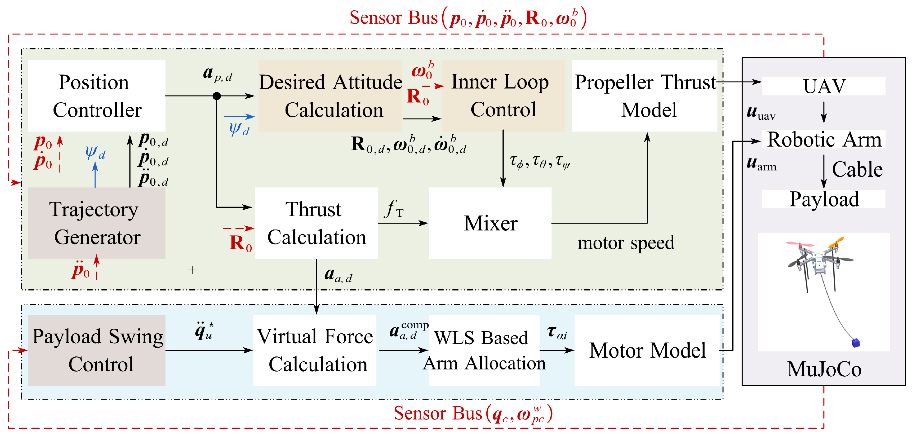 - (arm-swing coupling): When the robotic arm joints accelerate, the cable attachment point displaces, directly affecting the payload swing dynamics. This coupling is the key innovation enabling cooperative control—the arm can actively reshape swing dynamics without requiring platform attitude changes.
