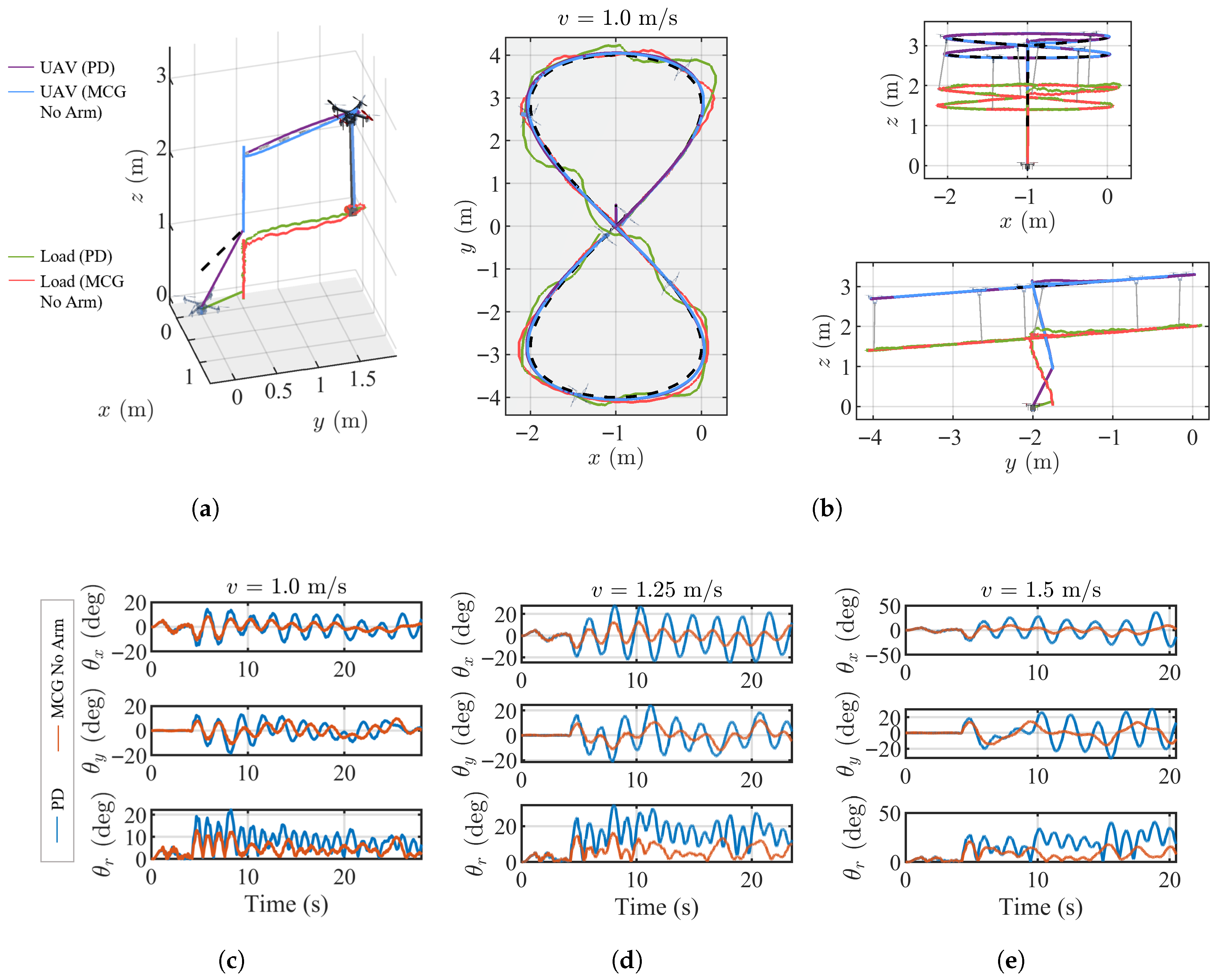 - MCG feedback linearization with geometry-aware swing compensation: A hierarchical controller combining SO(3) attitude regulation with weighted least-squares swing allocation. The compensation torque is computed adaptively based on swing geometry (Equation (32)), eliminating the need for gain scheduling across 5× payload mass and 4× cable length variations while enforcing actuator constraints through command shaping.